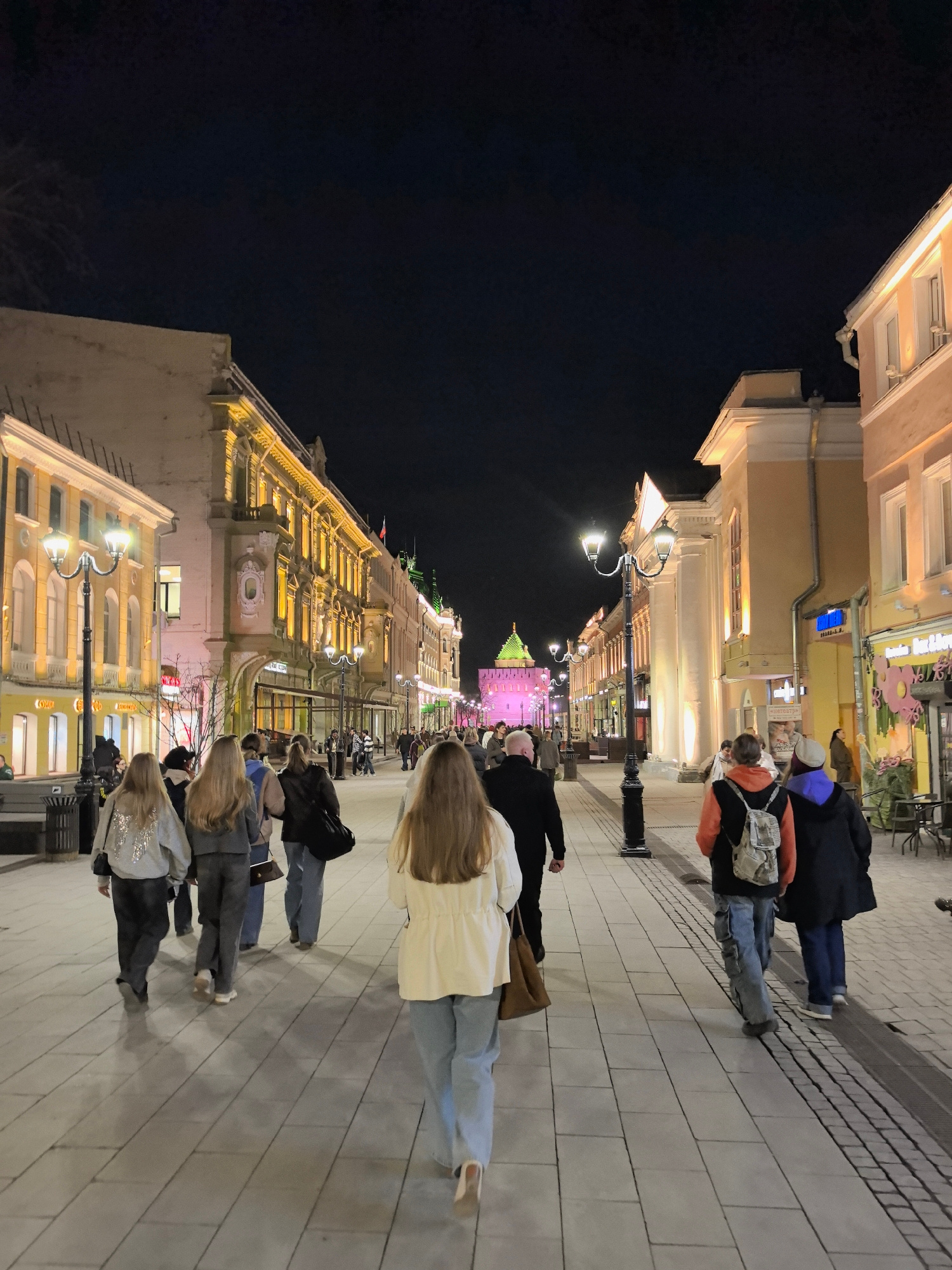The image shows a nighttime view of a pedestrian street in Nizhny Novgorod, Russia. A group of people are walking away from the camera down the center of the paved street. The street is lined with ill…read more