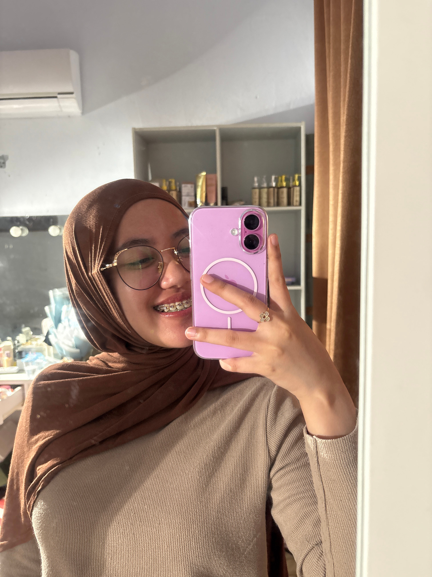 A person with brown hijab and eyeglasses is taking a selfie with a purple phone. The person has braces on their teeth and a flower-shaped ring on their finger. The background shows a shelf with items…read more