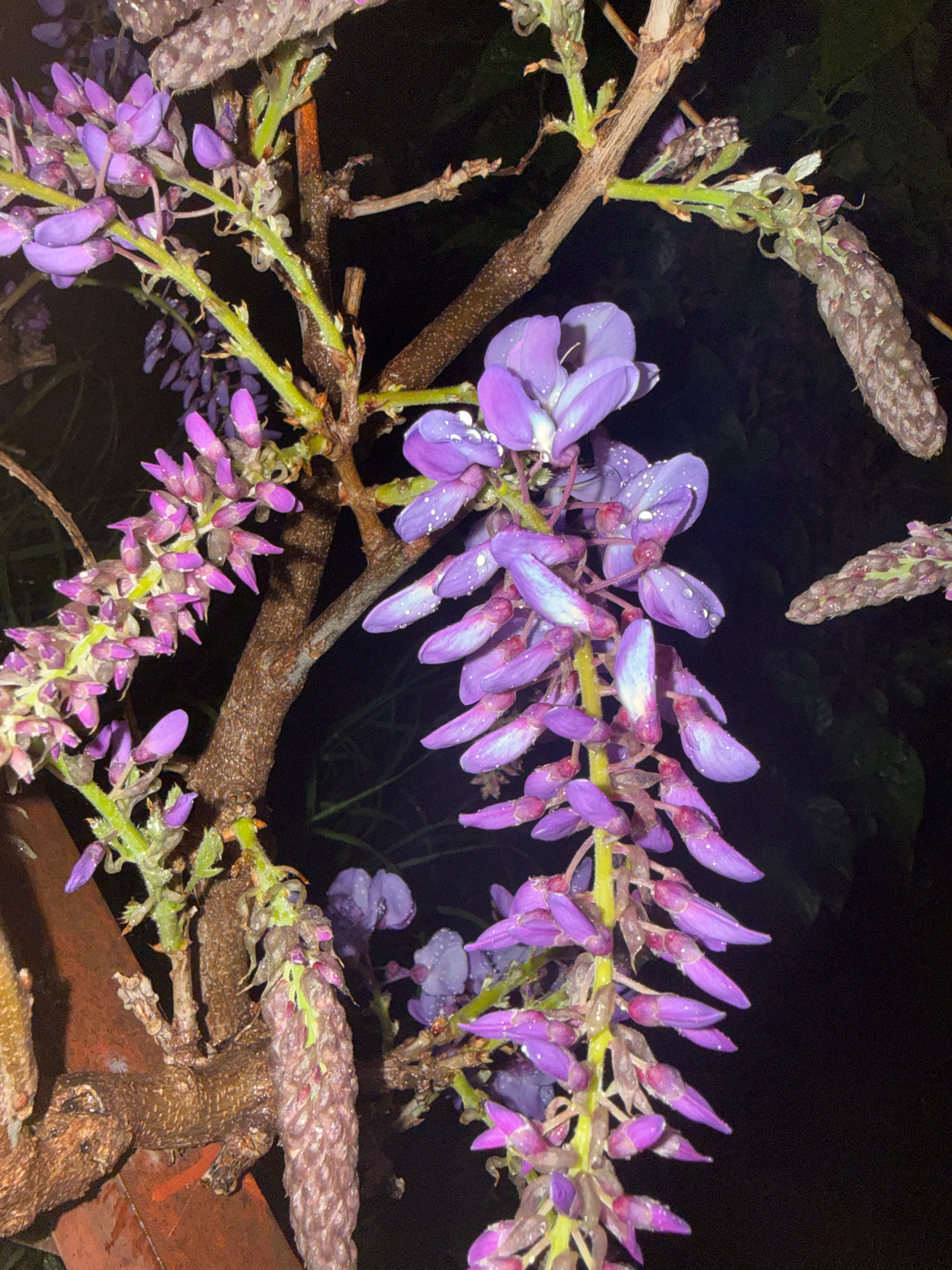 The image shows a close-up of a wisteria plant with purple flowers, some open and some still in bud. The flowers and branches appear to be wet, possibly from rain. The background is dark, suggesting iā¦read more