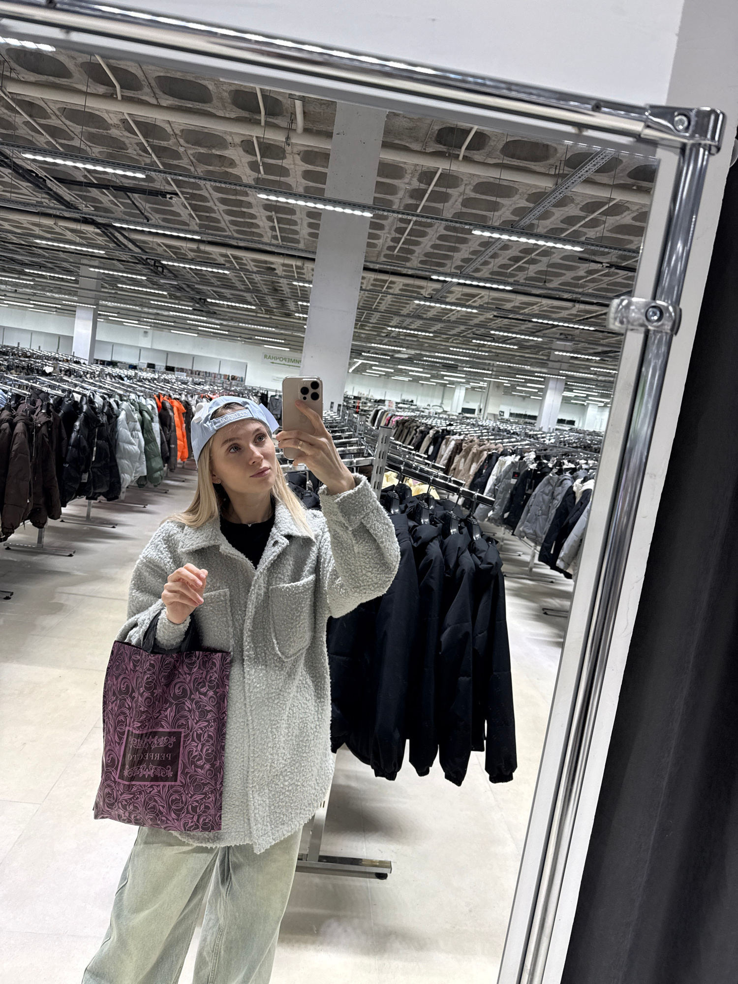The image captures a young woman taking a selfie in a mirror within a large retail environment, possibly a warehouse store, due to the extensive rows of clothing racks and high ceilings. The woman is…read more