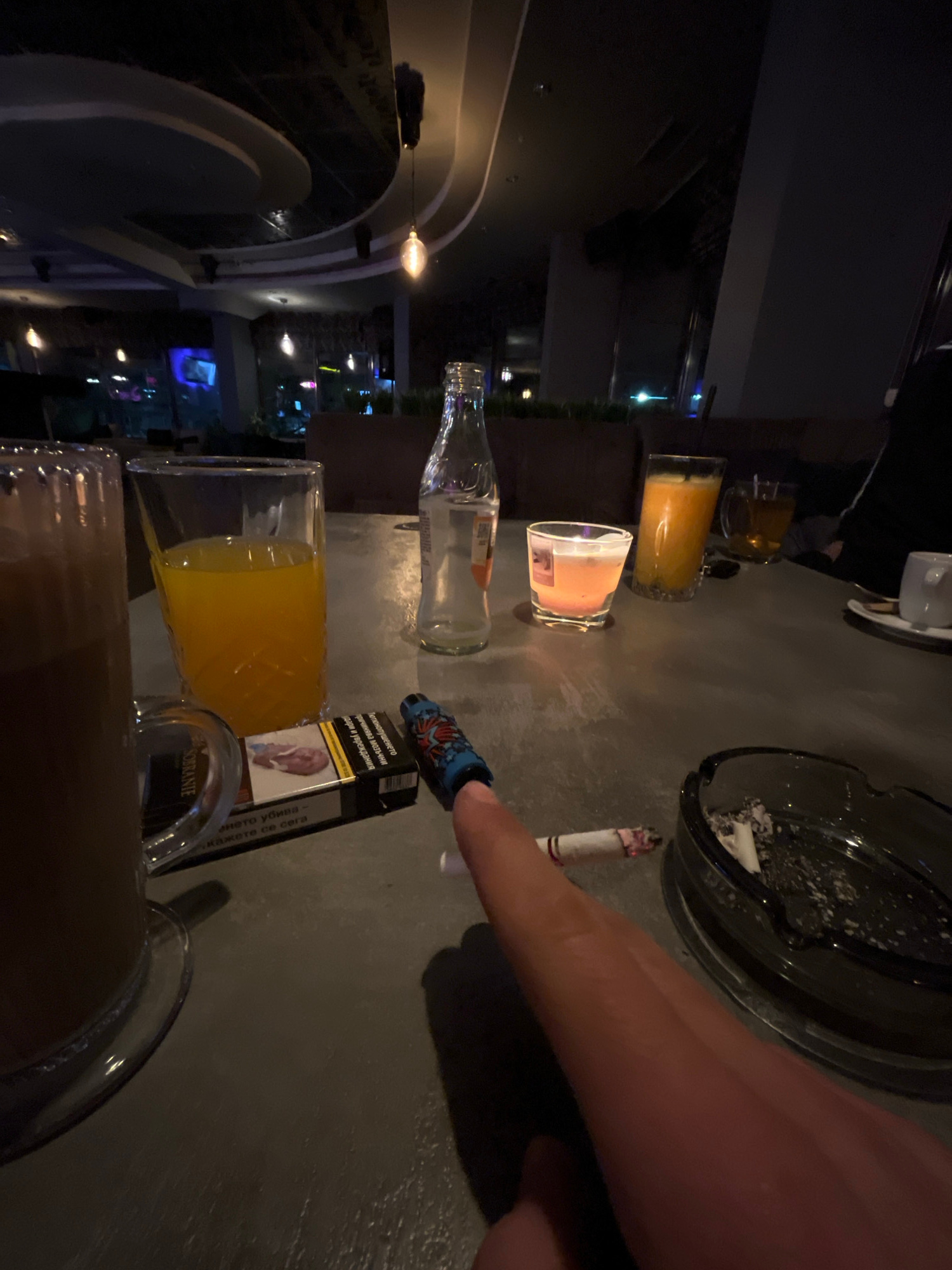 The image shows a table scene in what appears to be a bar or cafe. Multiple beverages are present, including two glasses of orange juice, one glass with a brown drink, and an opened bottle of water. A…read more