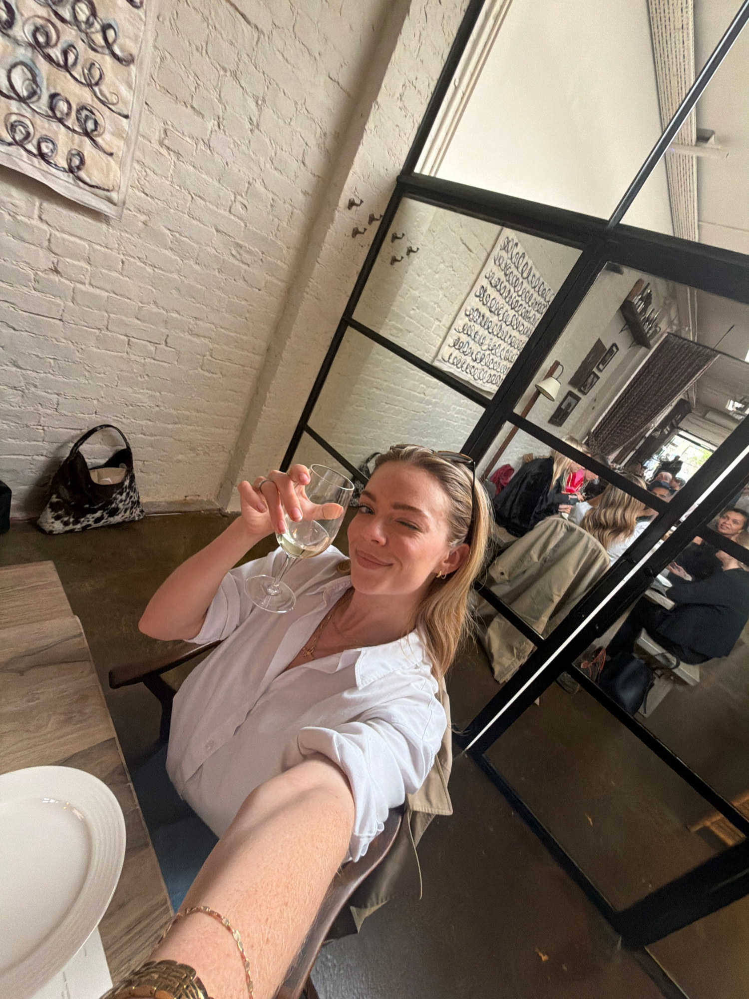 The image is a selfie taken in what appears to be an indoor restaurant or cafe space. A woman is holding a glass of white wine. She is wearing a white button-down shirt, and jewelry that is a necklace…read more