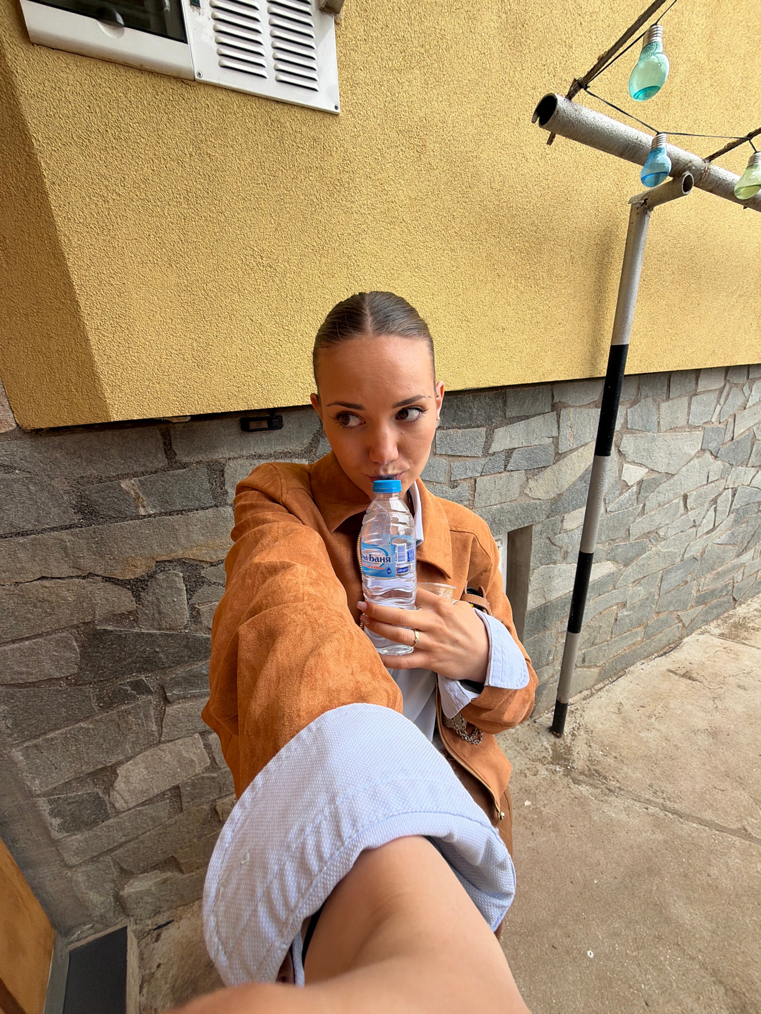 The image shows a woman drinking from a water bottle while standing outside in what appears to be an urban environment. She is wearing a brown jacket and a light blue shirt. The background includes a yellow wall, a stone walkway or street, and a metal pipe structure with attached bottles. The water bottle label has Cyrillic characters, and given the location provided, it is likely in Bulgarian. The location is specified as the city of Buhovo, Bulgaria. | Open Wire