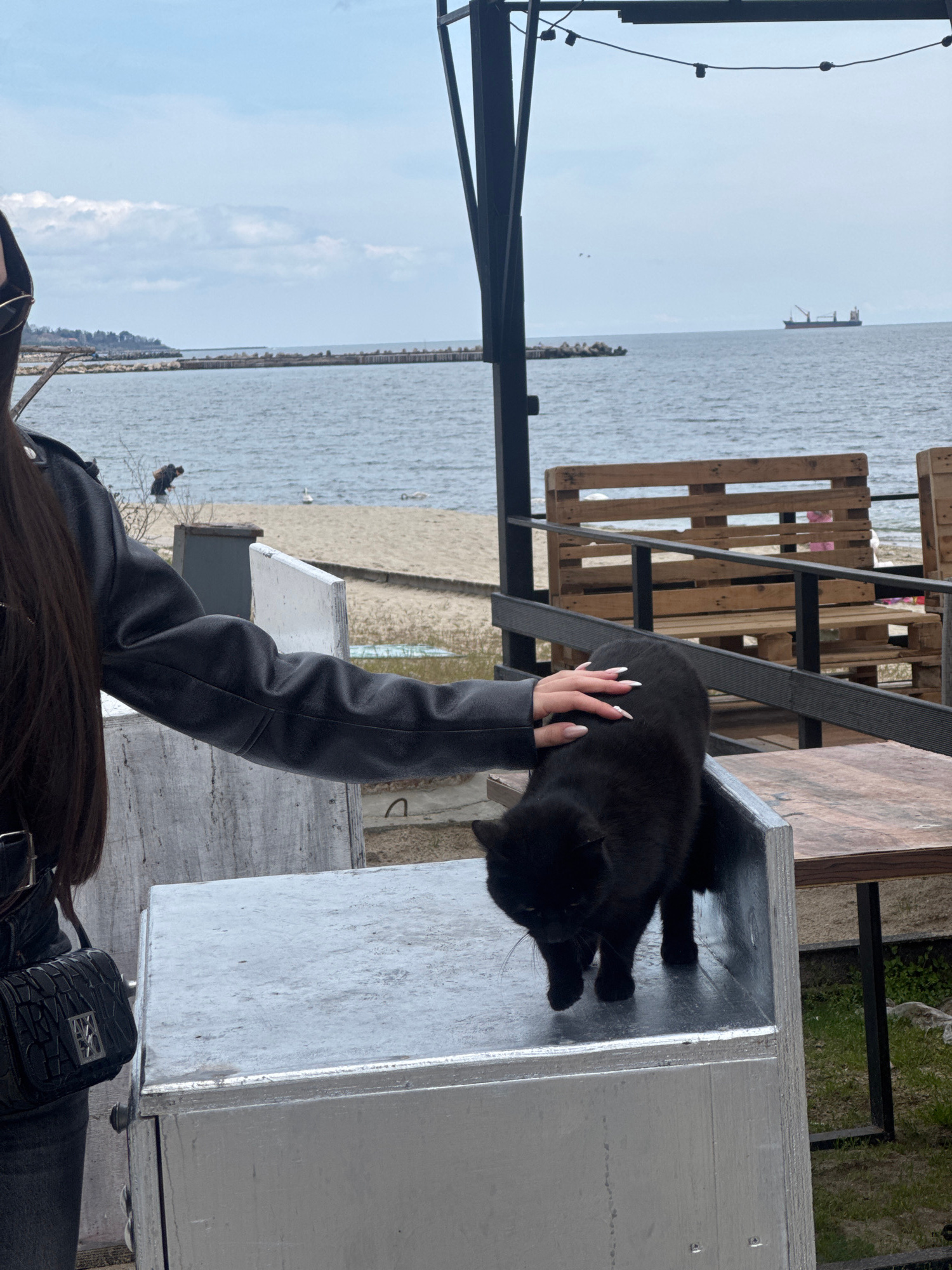 A vertical, medium shot shows a person petting a black cat on a silver metallic surface near the sea. The person, seen from the shoulders down, wears a dark jacket and has long brown hair. Their left…read more