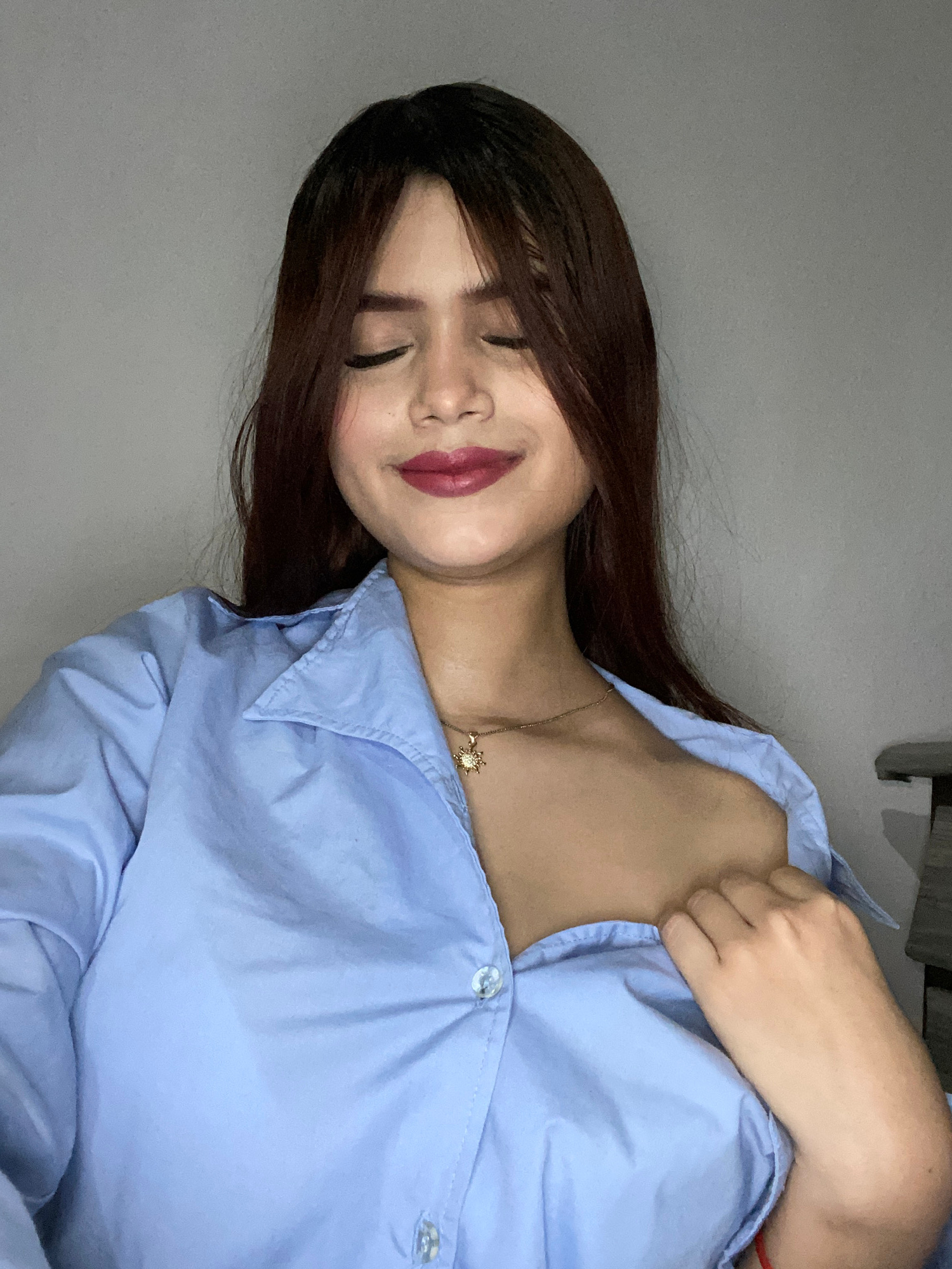 A young woman is angled vertically in the frame, wearing a light blue, unbuttoned shirt that exposes her shoulder and a gold necklace. She has long, dark brown hair, a soft smile, and closed eyes. The…read more