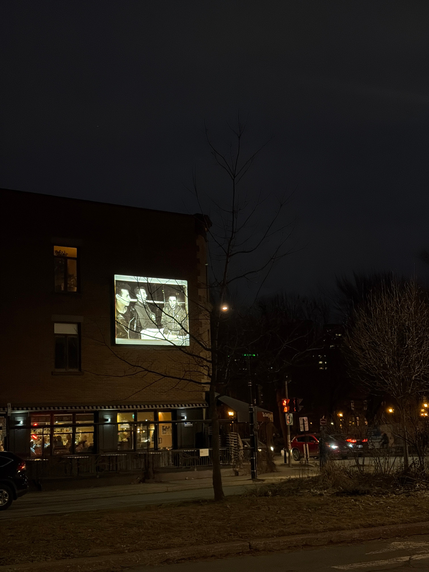 Here's a description of the image: A low-angle nighttime view showcases a tall brick building in Montreal, Canada. The building's façade features several windows: one large window has an image projec…read more