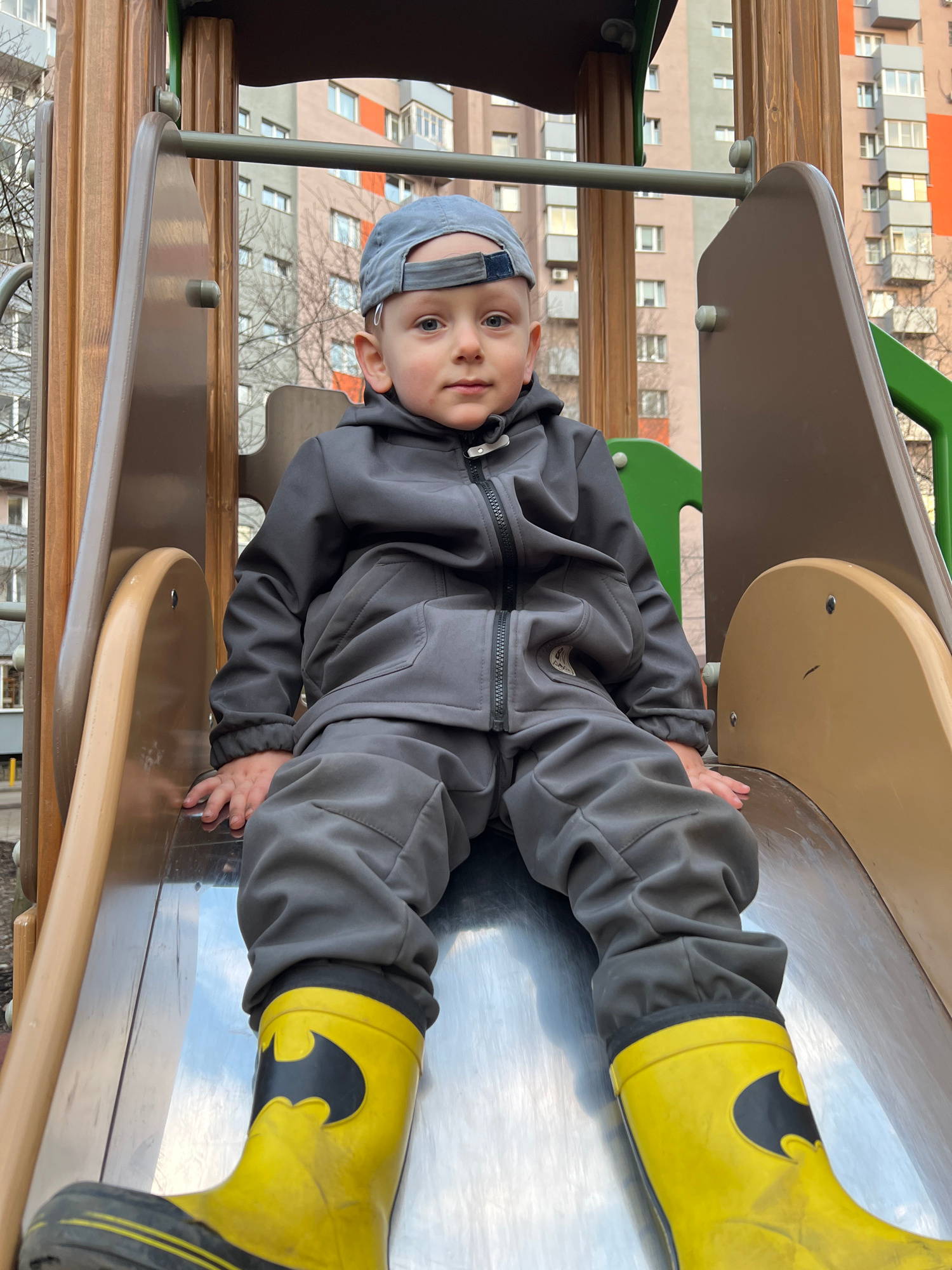 A child, dressed in a gray tracksuit and yellow Batman-themed rain boots, is lying on a metal slide in a playground. He wears a gray cap. The playground is located near a multi-story building in Mytis…read more