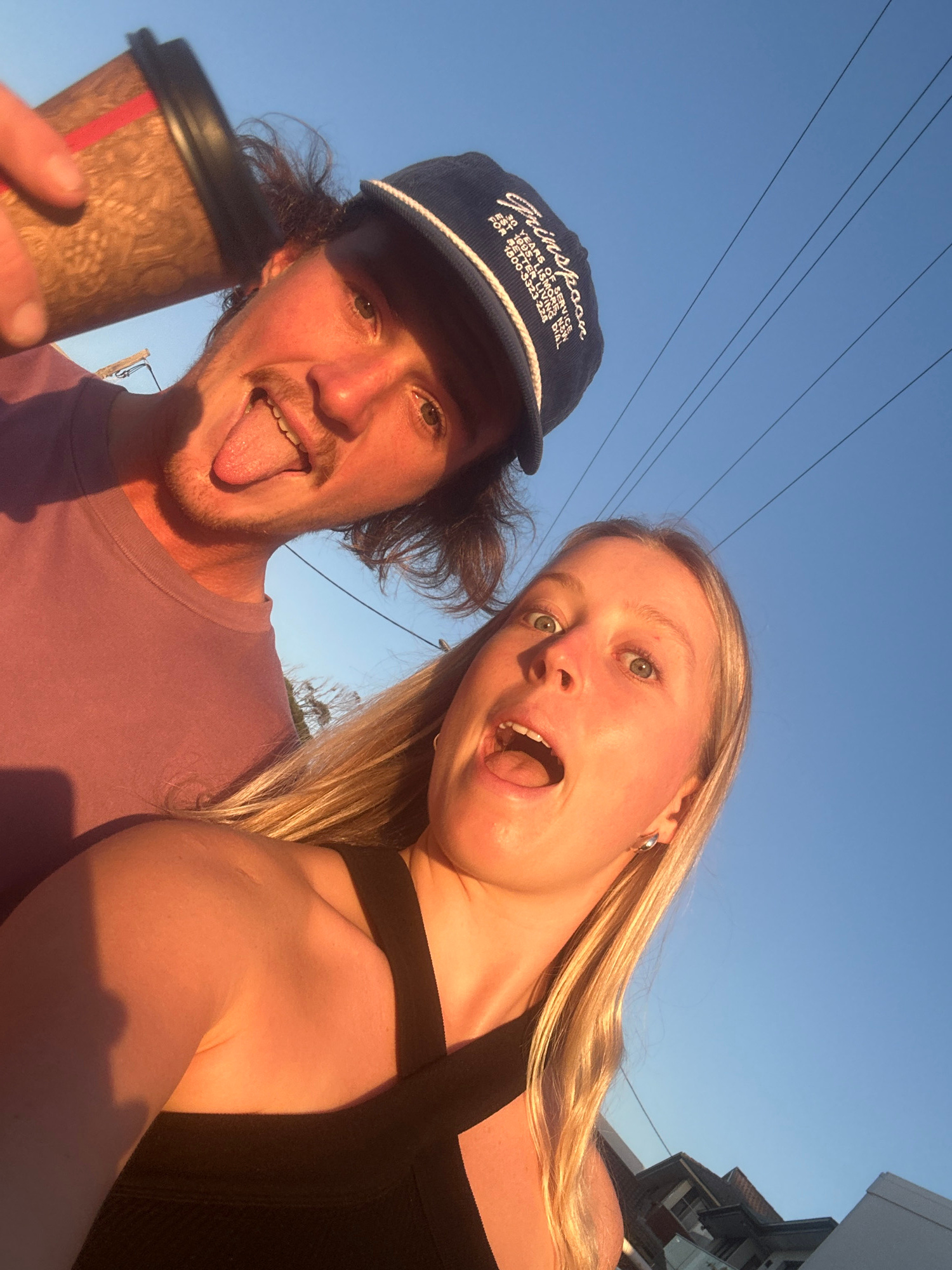 Two people are posing for a selfie outdoors in the late afternoon or early morning sunlight, likely in or near the city of Bulli, Australia, judging by the inscription "1995. LISMORE NSW" on the navy…read more