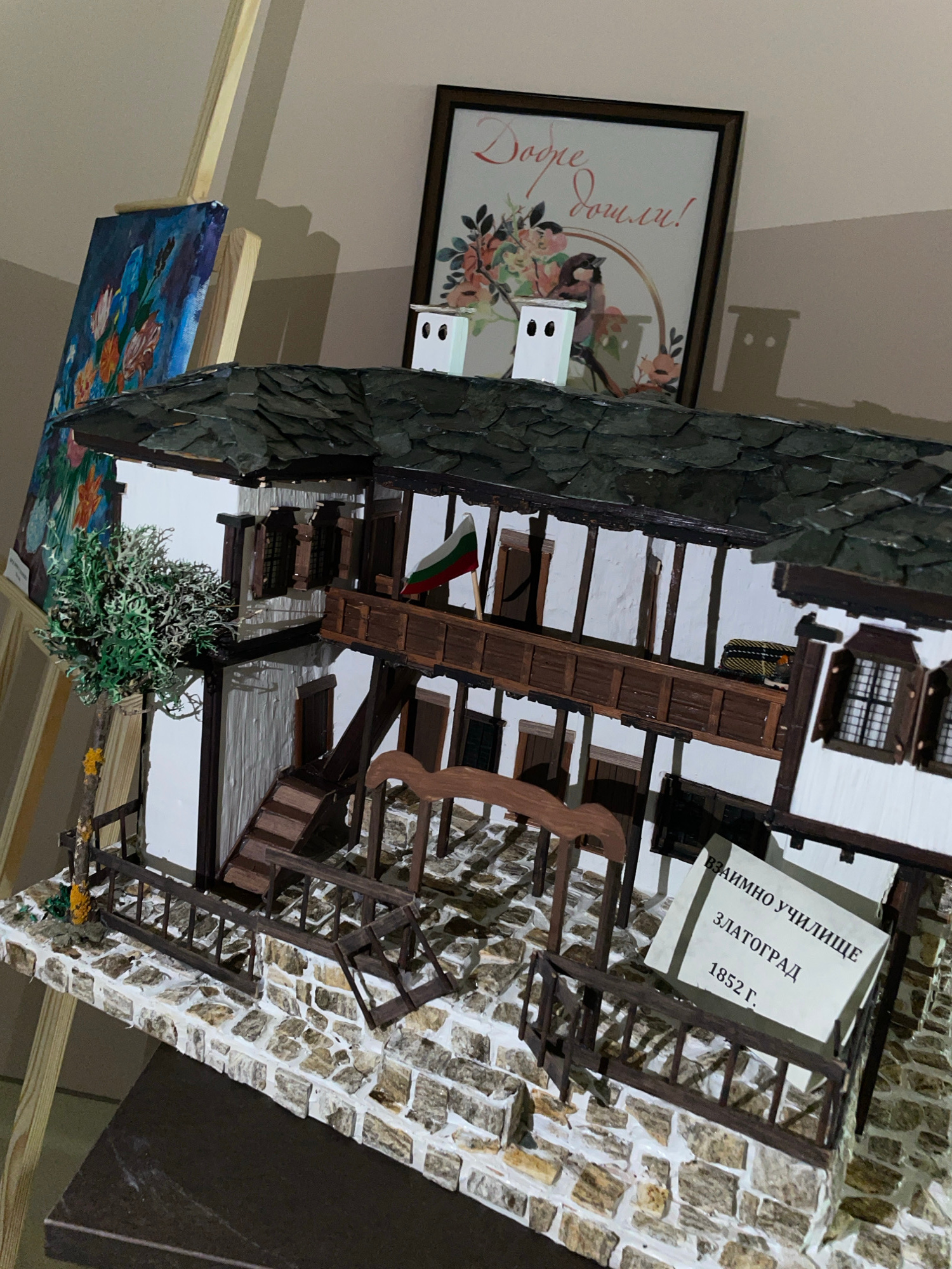 The image shows a diorama or model of the Vzaimno Uchilishte in Zlatograd, Bulgaria, established in 1852. The model features a stone facade, white walls, and wooden details. A sign indicates the name…read more