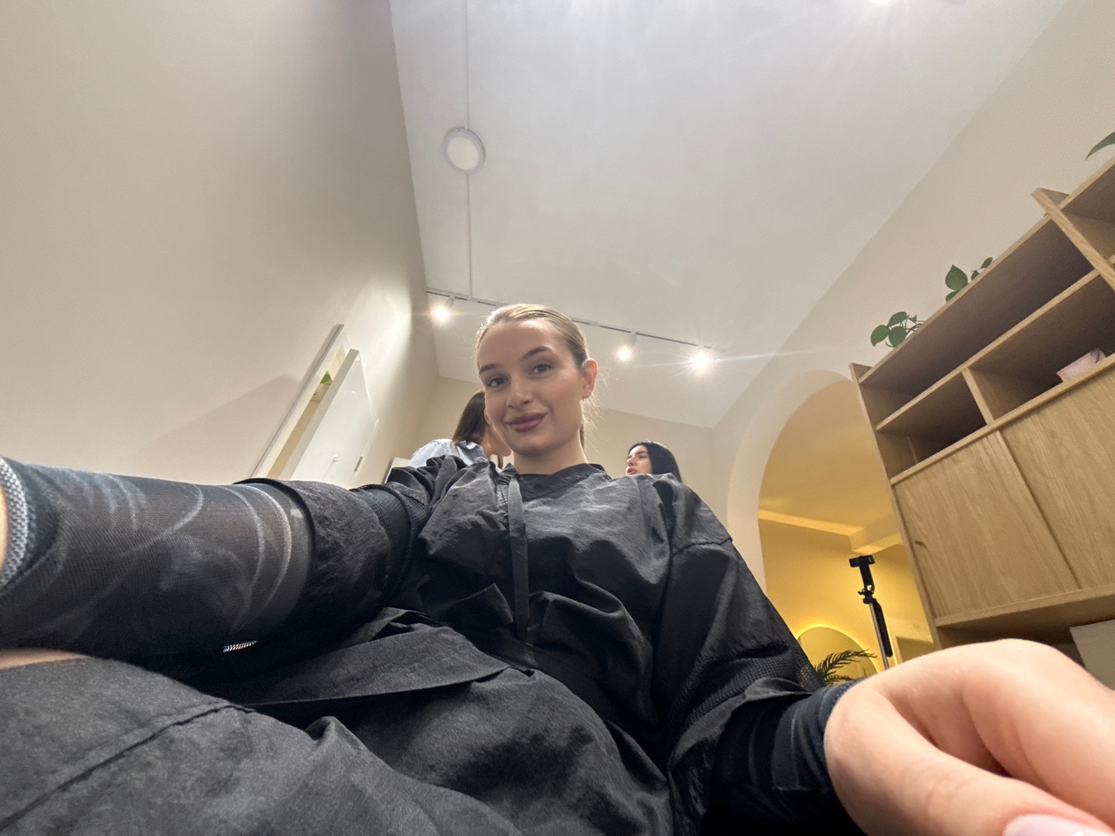 An indoor scene is captured from a very low-angle perspective, looking upwards. A young woman with blonde hair, pulled back, is the primary subject, positioned above the camera and looking down into iā¦read more