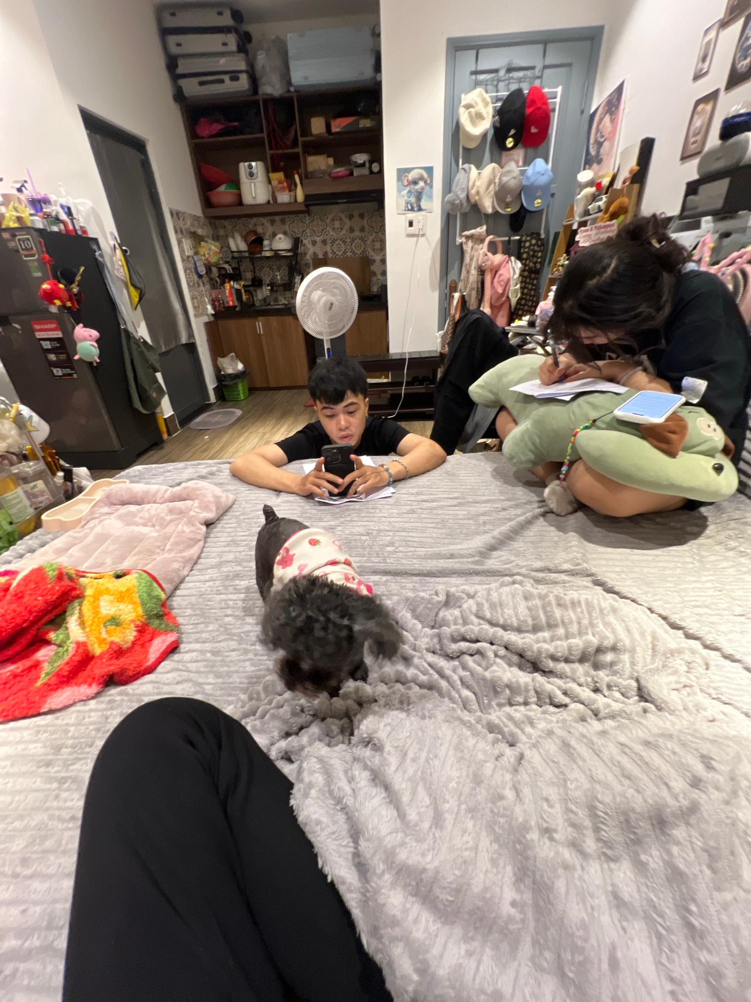 The image shows an indoor scene. Two people, one a young adult female with dark hair, and the other a young adult male, are on a bed. The female is crouched and appears to be writing on a document sup…read more