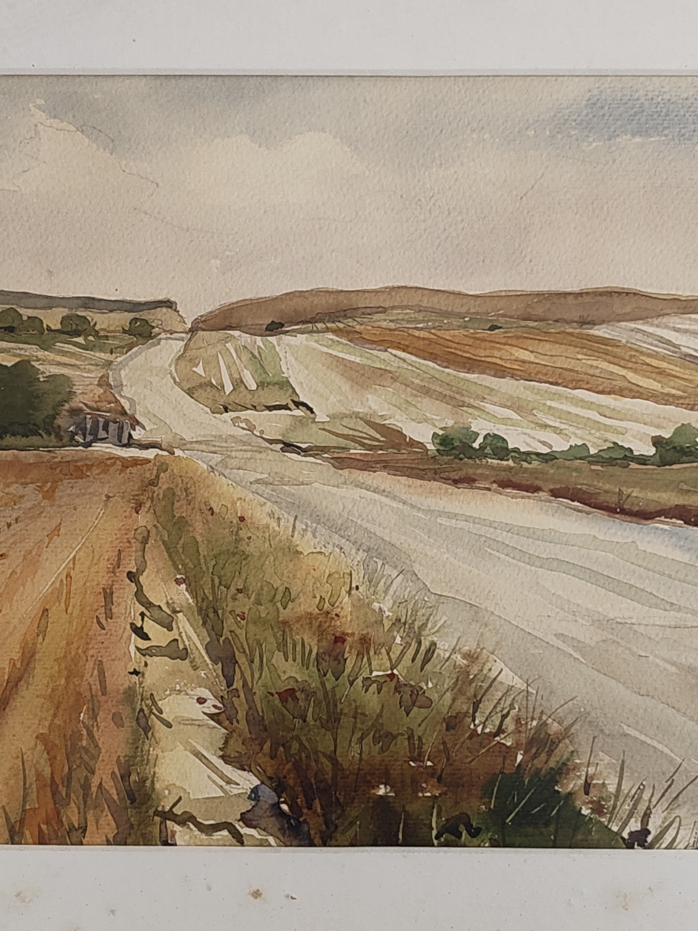 The image is a watercolor painting depicting a rural landscape. A road curves through the scene from the foreground to the background. The foreground features patches of vegetation and dirt. To the le…read more