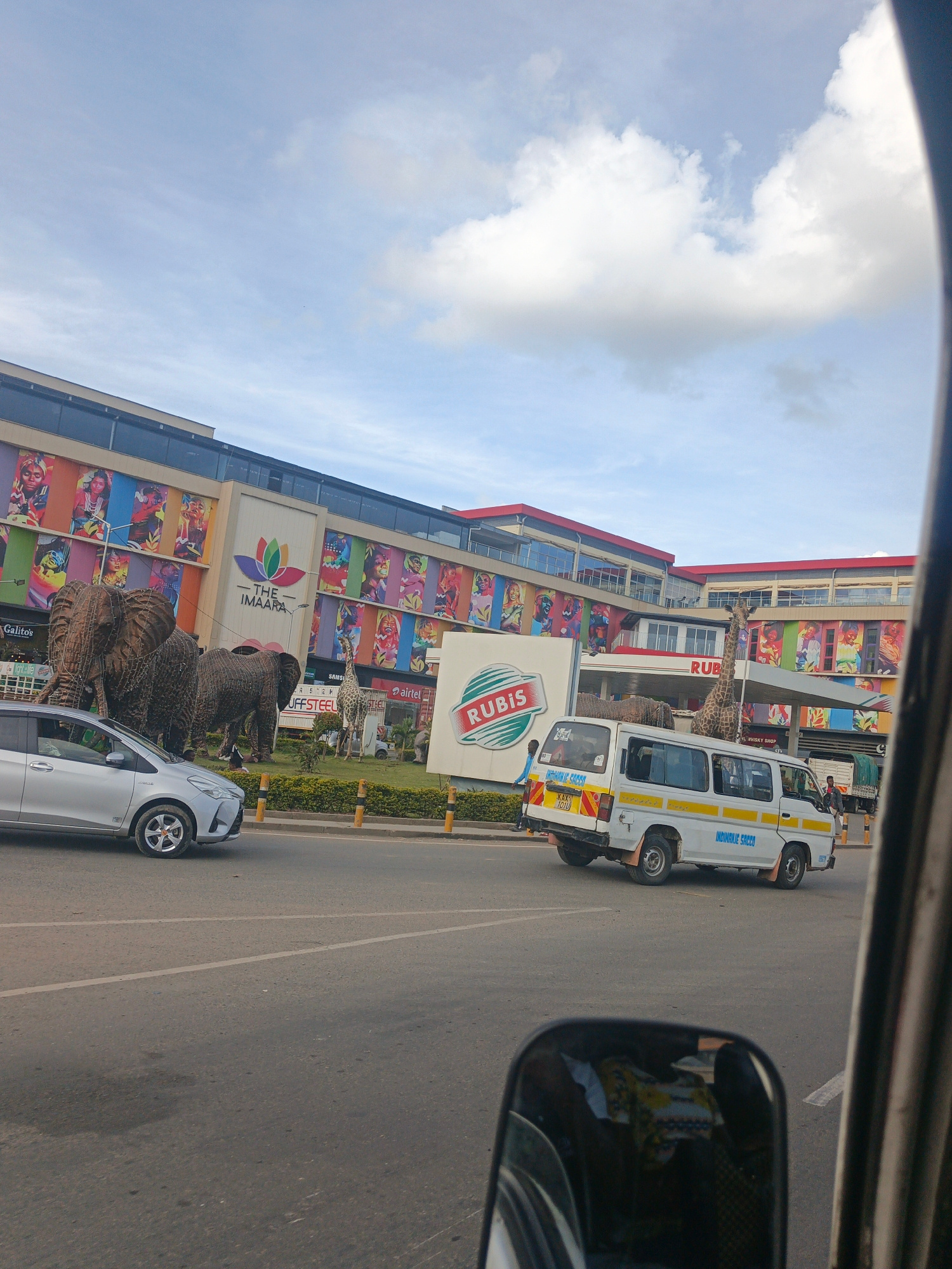 The image shows a street view in Nairobi, Kenya, with "THE IMAARA" shopping mall prominently displayed in the background. Wire sculpture elephants and a giraffe are in front of the mall, near a Rubis…read more