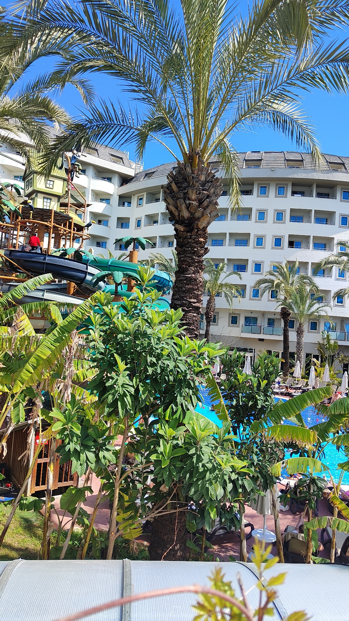 The photograph captures a vibrant scene at a resort in Alanya, Turkey, prominently featuring a water park with slides and a large hotel building in the background. The water park structure is made of…read more