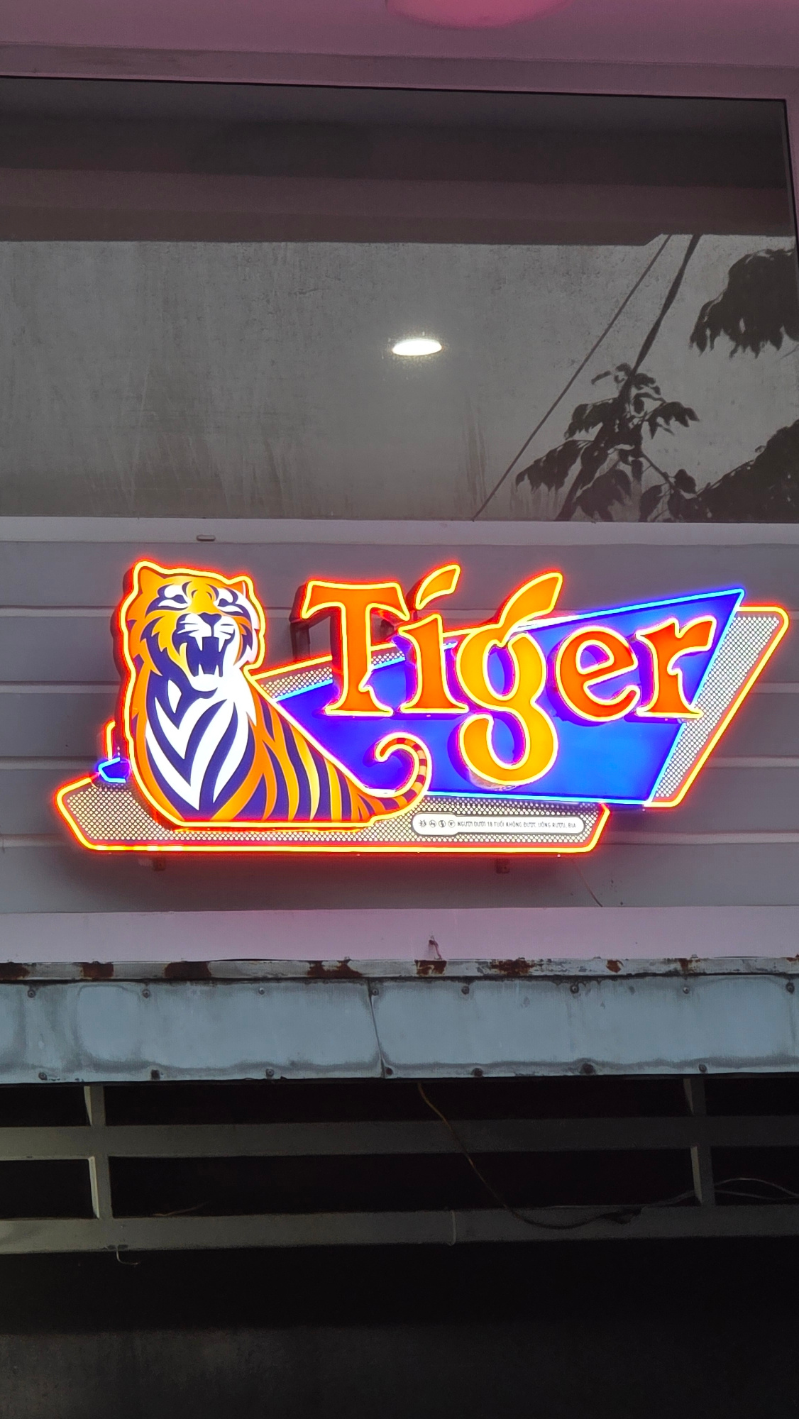 A vertical, rectangular, neon-lit sign for “Tiger” hangs outside in Nha Trang, Vietnam. The sign is affixed to a pale grey wall. The word “Tiger” is spelled out vertically in orange neon, above an ima…read more