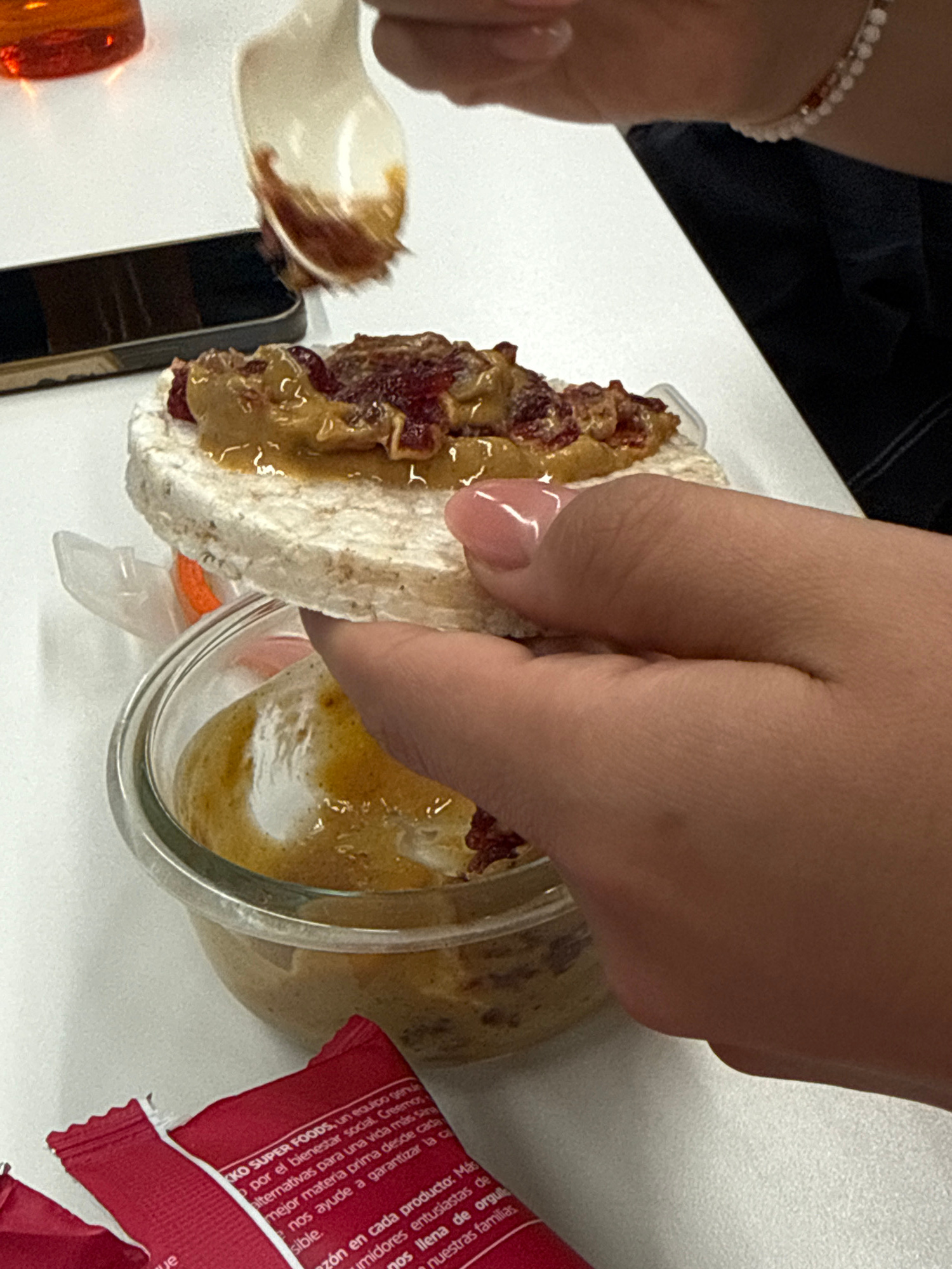 Here is a description of the image: A close-up shot depicts a person's hand holding a rice cake topped with peanut butter and what appears to be cranberry sauce. The rice cake is slightly cracked. Ne…read more