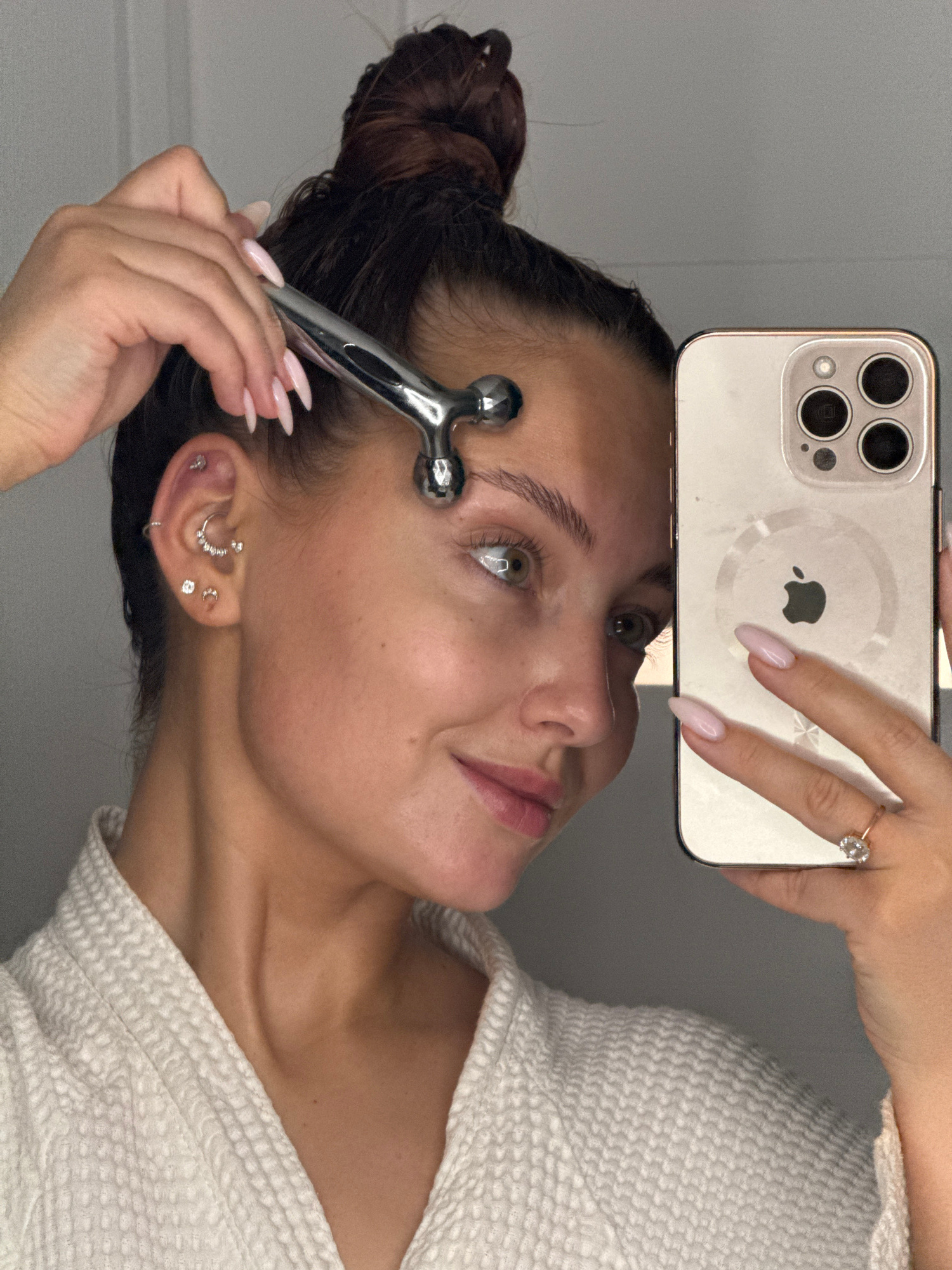 A woman is holding a smartphone above her forehead, using it to take a selfie. She is also holding a silver facial roller to her face. She has her hair pulled back in a bun and is wearing a light-colo…read more