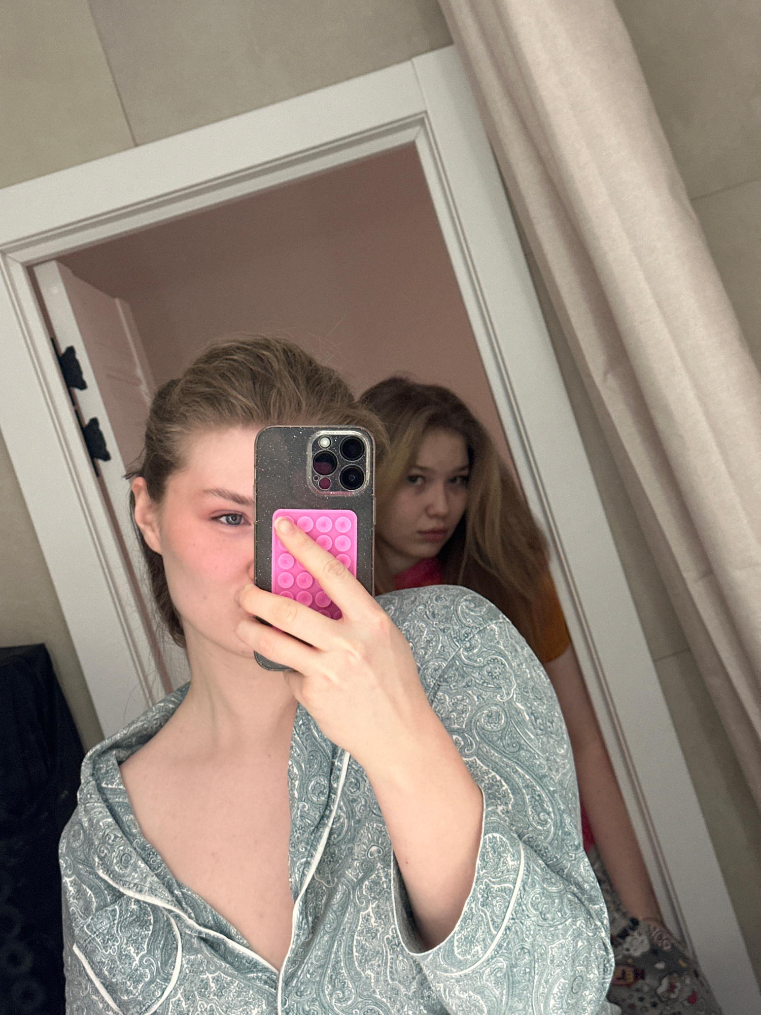 A woman is taking a selfie in a mirror. She has blonde hair and is wearing a light blue paisley patterned pajama top. The reflection in the mirror shows another woman with long blonde hair wearing a b…read more