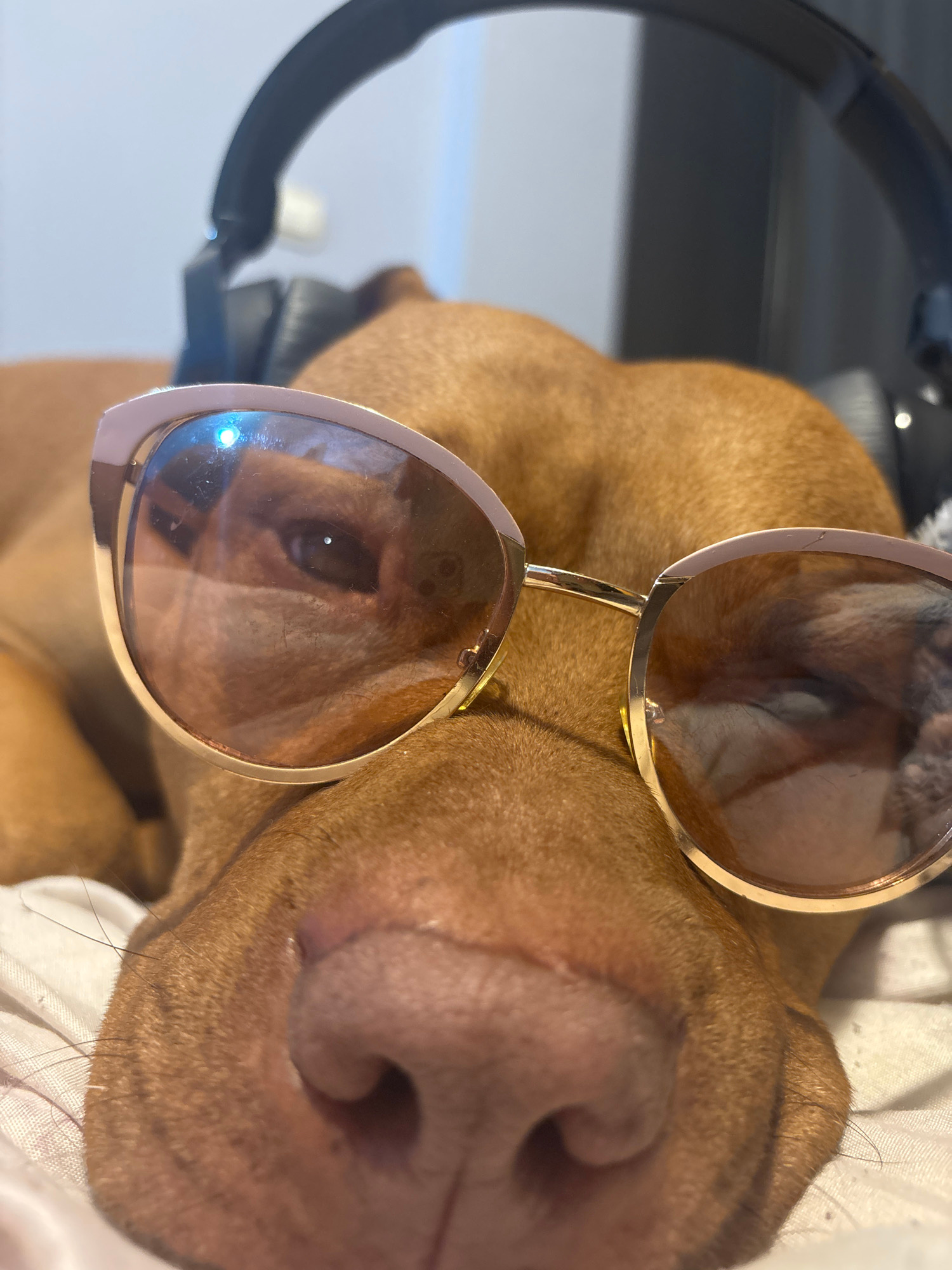 A close-up indoor shot shows a brown dog wearing sunglasses. The dog's nose is prominent on the left. The sunglasses have a gold frame and reflect the dog's eye. Behind the dog's head is a black headsβ¦read more