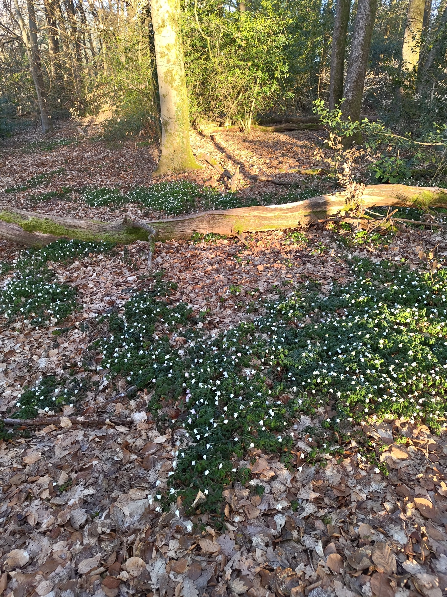 The image depicts a forest floor in Mettlach, Germany. The ground is covered in a mix of fallen brown leaves and a dense carpet of small white flowers with green foliage. A fallen tree trunk lies acroβ¦read more