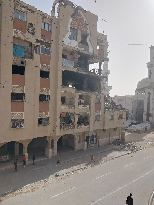A severely damaged beige building stands next to a wide road. The building’s facade is missing in parts, revealing exposed brick and structural elements. Some windows are intact, while others are gapi…read more