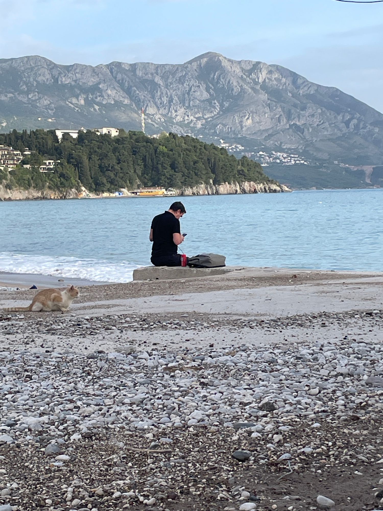The image captures a scene in Budva, Montenegro. A man dressed in black stands on a concrete wall along the beach, looking at a phone. A sandy-colored cat stands near the edge of the wall, looking up.…read more