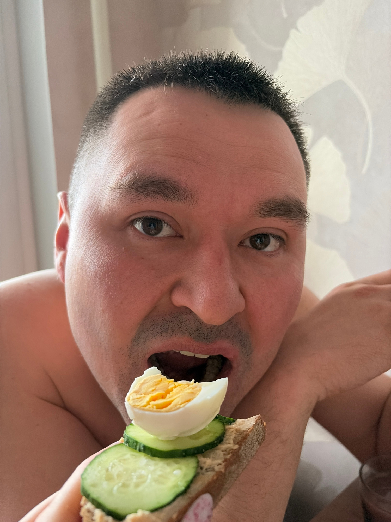 A close-up, tilted view shows a man eating a sandwich. The sandwich contains sliced hard-boiled egg and cucumber on brown bread. The man has dark hair, light skin, and is shirtless. The background is…read more