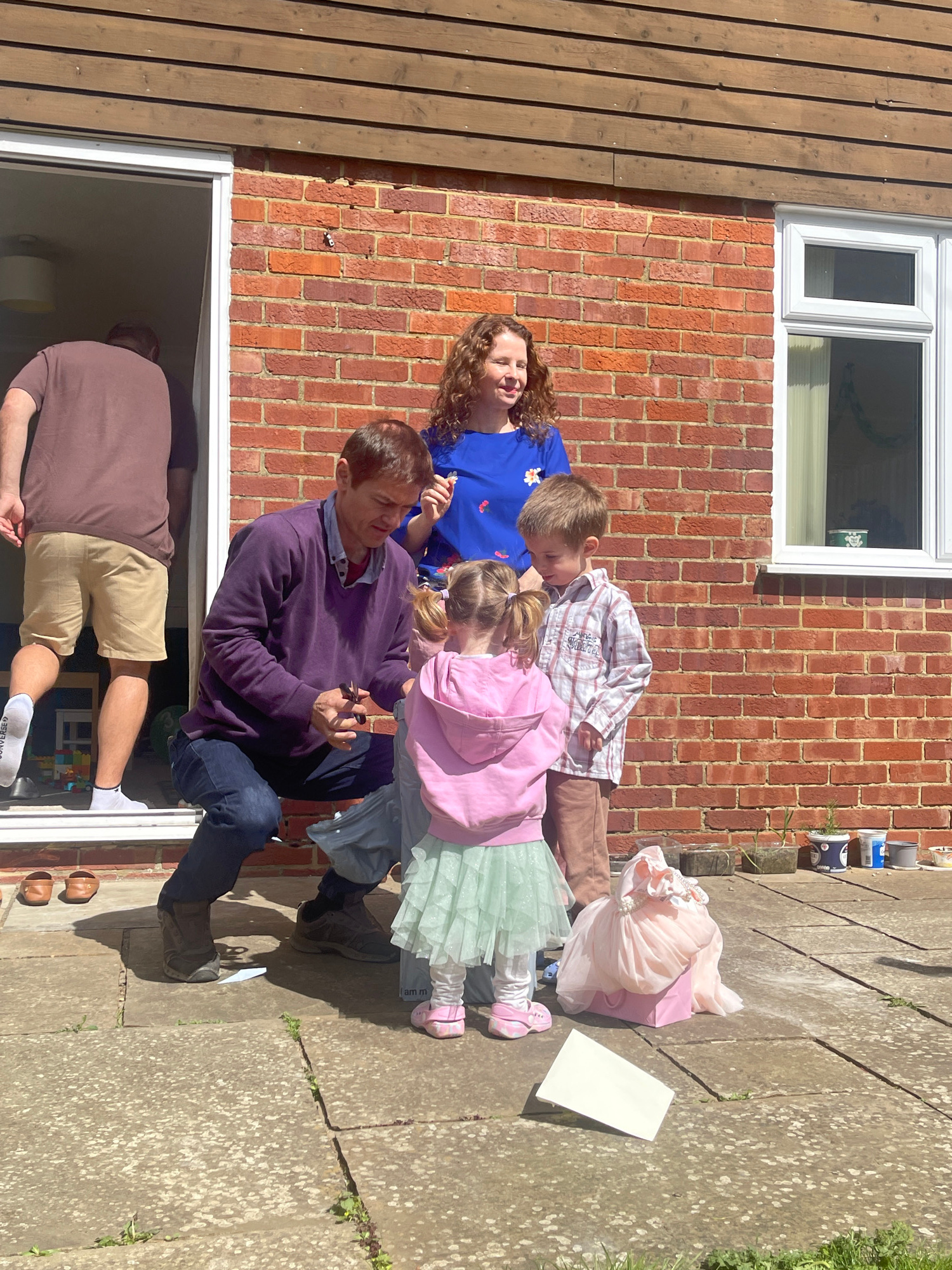 The image depicts a family gathering outdoors, likely a garden patio adjacent to a brick house with a wooden-paneled exterior section and a white-framed window. There are three adults and two childre…read more