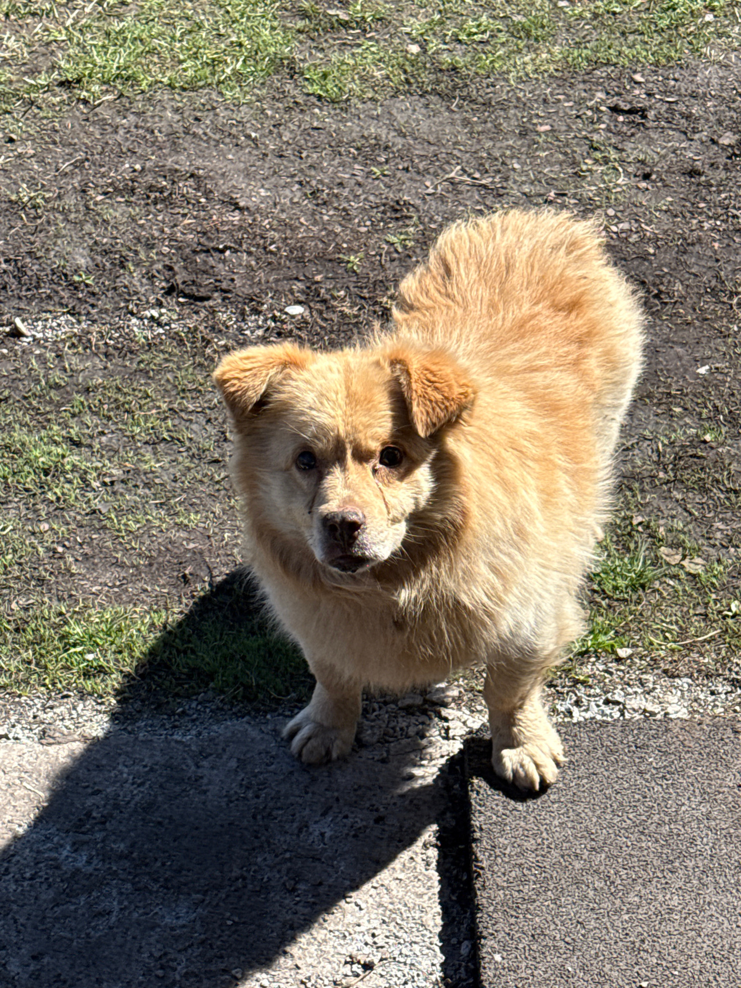 A medium-sized, fluffy, tan-colored dog stands on a surface divided between dirt/grass and a concrete slab with gravel borders. The dog is oriented towards the camera, looking upwards. The background…read more
