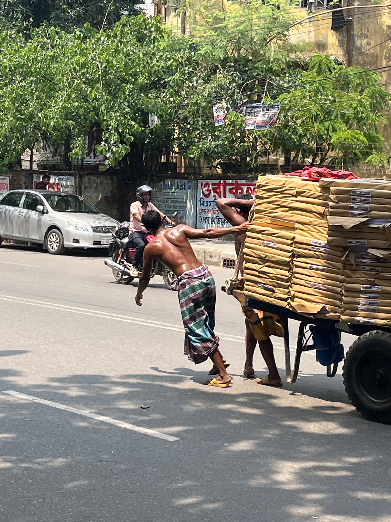 The image depicts two shirtless men transporting a large stack of packages on a hand-pulled cart along a paved street in Dhaka, Bangladesh. The packages appear to be bundled together and are stacked h…read more
