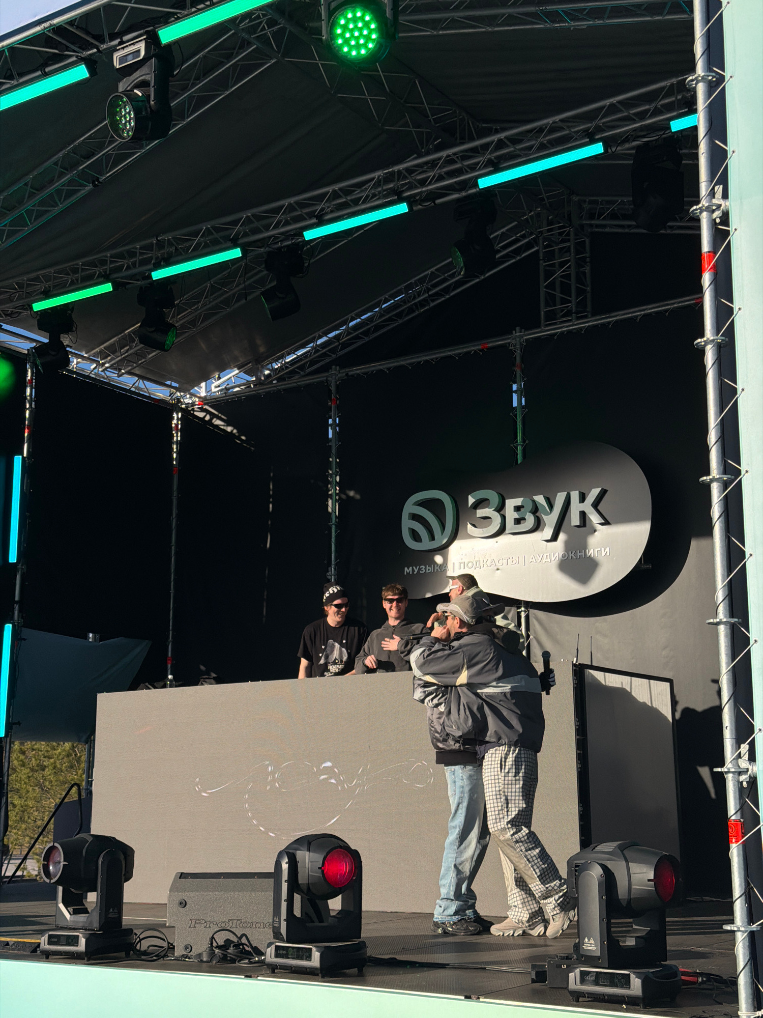 A stage is set up, possibly outdoors, under a grid-like structure supporting lighting equipment. A sign for "Звук" (Sound) is visible in the background. People are present on the stage. The location i…read more