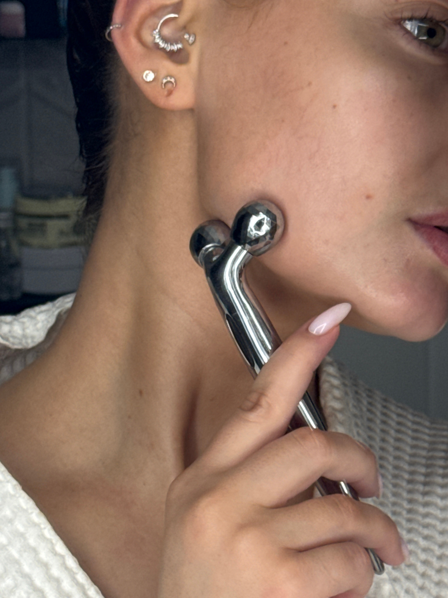 The image depicts a person using a metallic facial roller on their cheek. The person's left ear is visible, adorned with multiple piercings. The person's hand is holding the facial roller, and the thu…read more