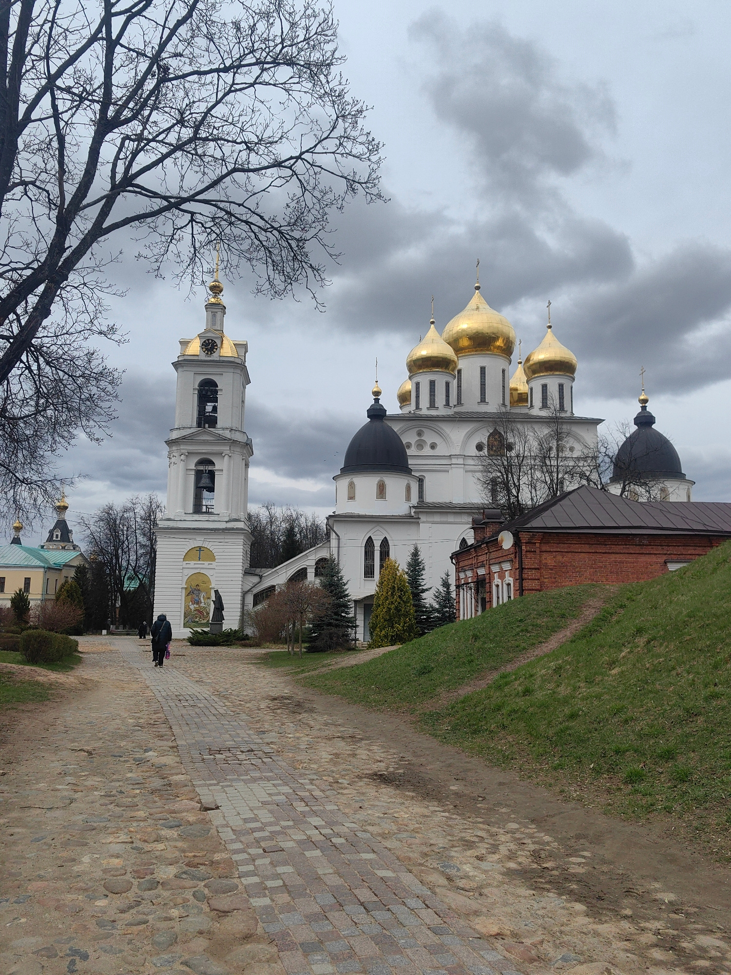 The image presents a panoramic view of the Assumption Cathedral complex in Dmitrov, Russia, under an overcast sky. A wide, uneven cobblestone path in the foreground transitions into a more regularly p…read more