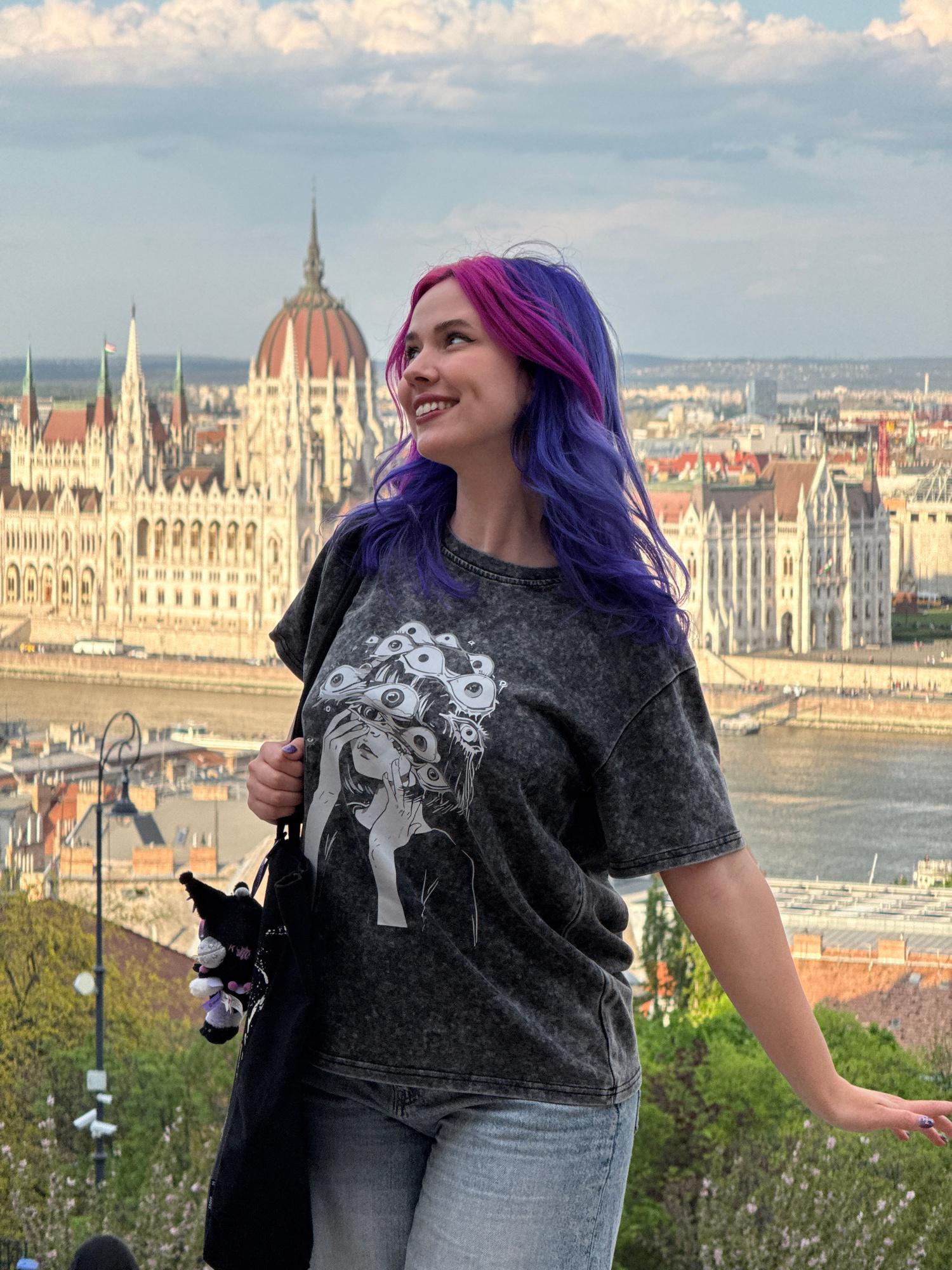 A young woman stands outdoors in Budapest, Hungary, with the Hungarian Parliament Building clearly visible in the background. The building, with its prominent dome, is situated across the Danube River…read more