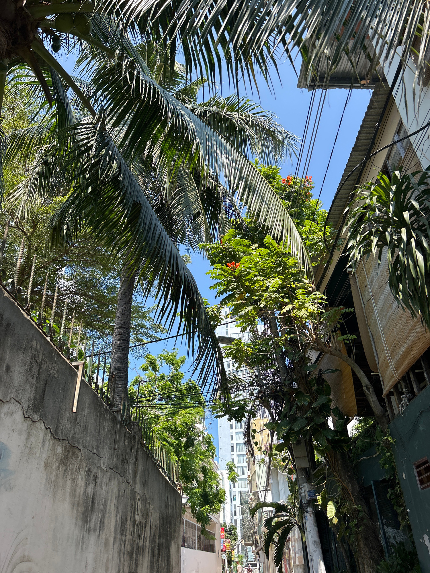 Captured from a low angle, the image depicts an urban scene in Bắc Nha Trang, Vietnam, with a focus on the sky framed by foliage and buildings. A large palm tree with its characteristic fronds dominat…read more