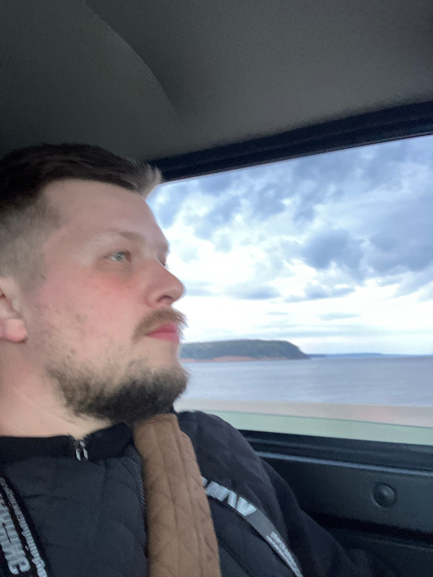 A man with light skin, light brown hair, and a beard is visible from the chest up. He is wearing a black vest with white lettering. The man's face is turned upwards, and the sky is visible through a s…read more