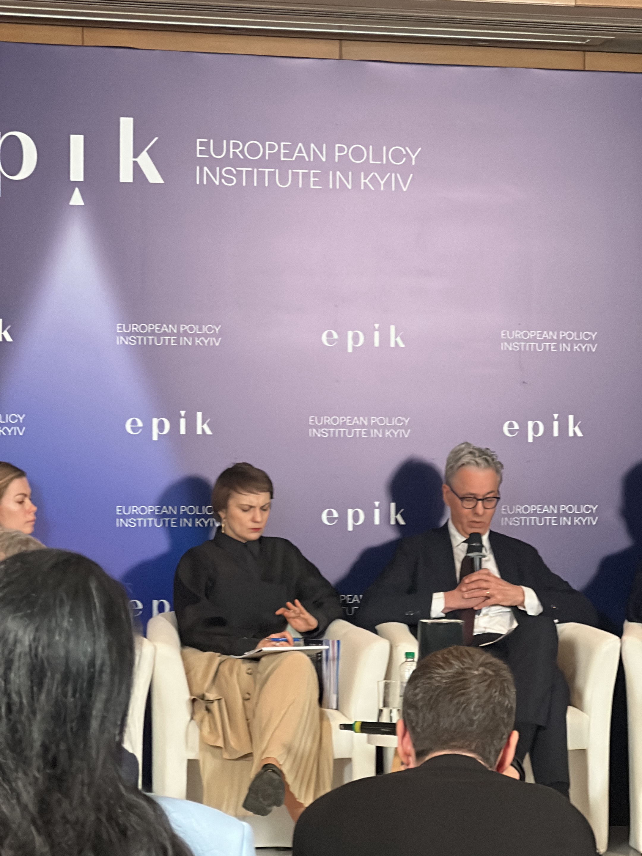 The image shows a panel discussion taking place in Kyiv, Ukraine. The backdrop features the logo of the "European Policy Institute in Kyiv" or "epik," repeated multiple times. There are two people on…read more