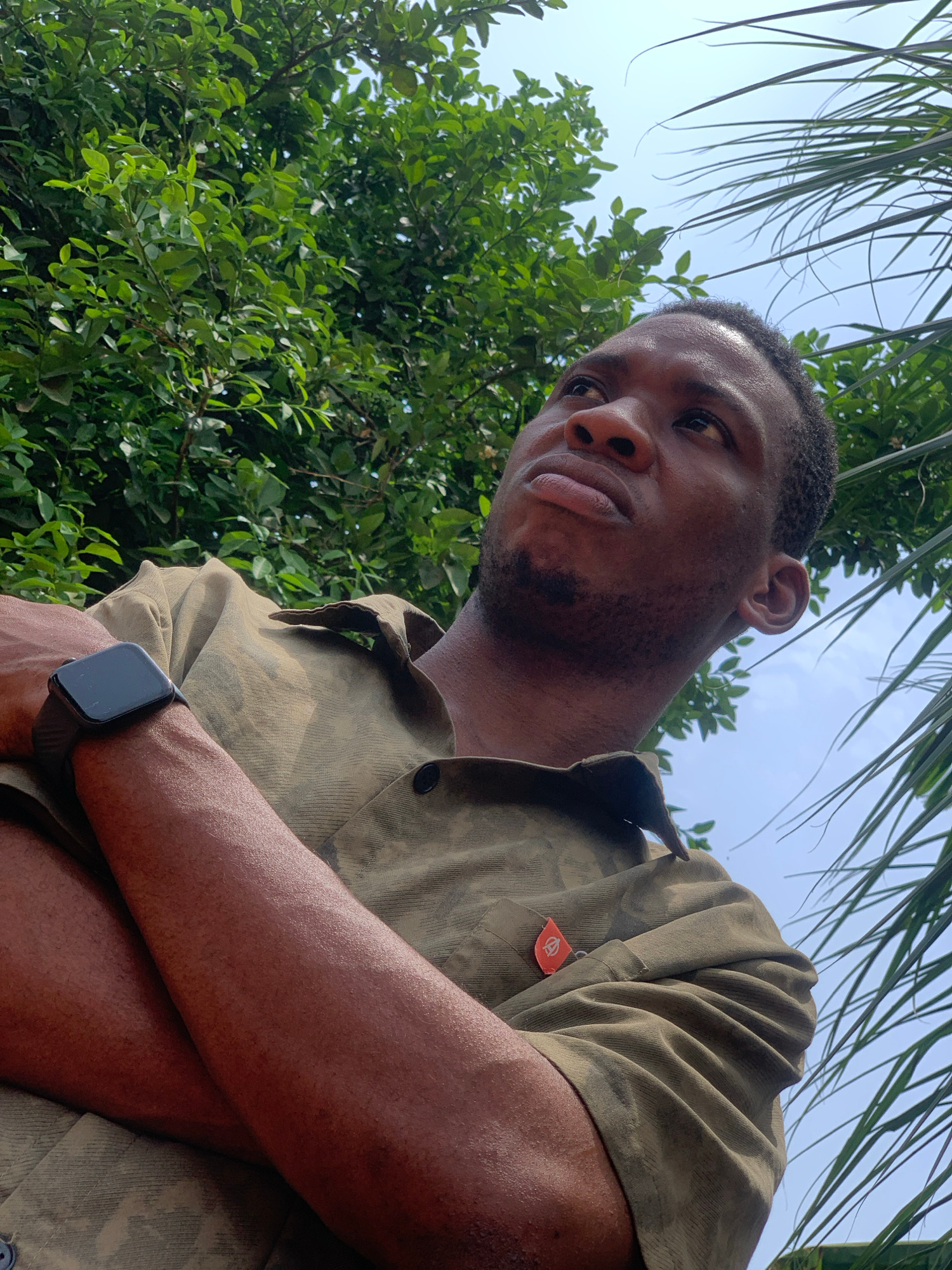 A dark-skinned man looks down at the camera. He has short, dark hair and a beard. He is wearing a button-up shirt, and a black smartwatch is visible on his left wrist. He has his arms crossed. Green lā¦read more