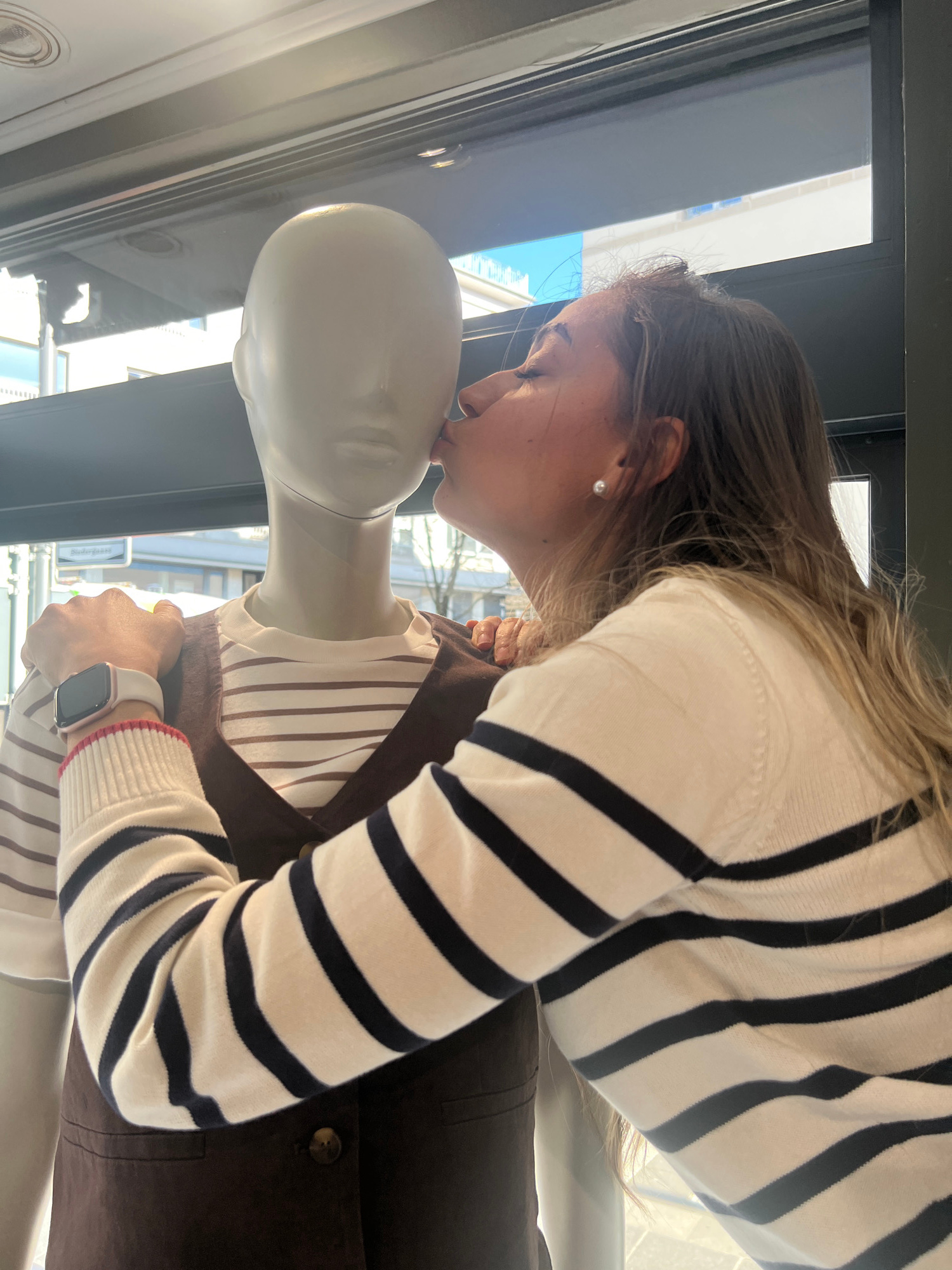 A woman in a striped sweater kisses a mannequin in the window of a store. The location appears to be in the city of Luxembourg, Luxembourg, as indicated by the architecture and street signs visible thβ¦read more
