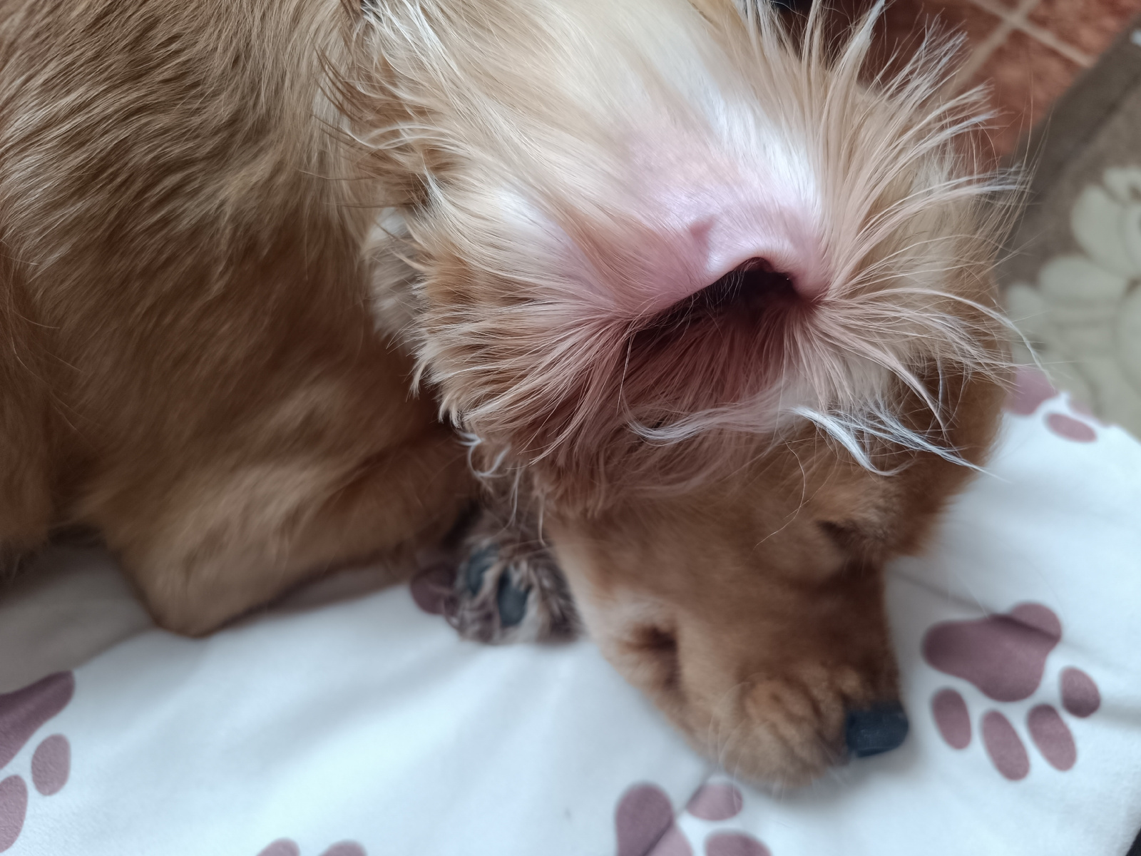 A close-up shot shows a reddish-brown dog sleeping on a white blanket with purple paw prints. The dog is curled up, with its head resting on the blanket. The fur around its ears is particularly long a…read more