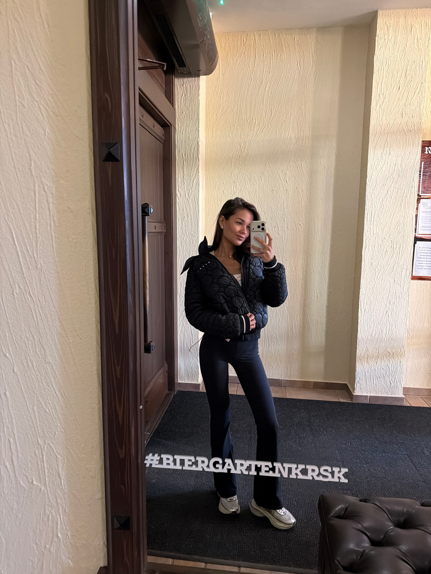 A woman stands in front of a full-length mirror, taking a selfie. She wears black leggings, a black quilted jacket, and light-colored sneakers. The mirror reflects a hallway with textured beige walls…read more