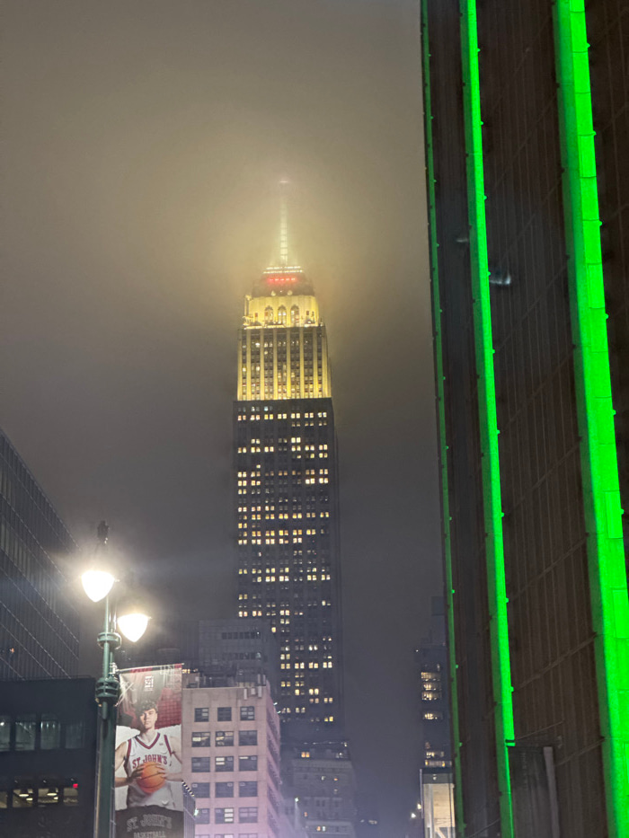 The Empire State Building rises through a dense fog, its top illuminated. The building's windows are lit, creating a grid-like pattern. A green light structure is visible above, possibly a bridge. Str…read more