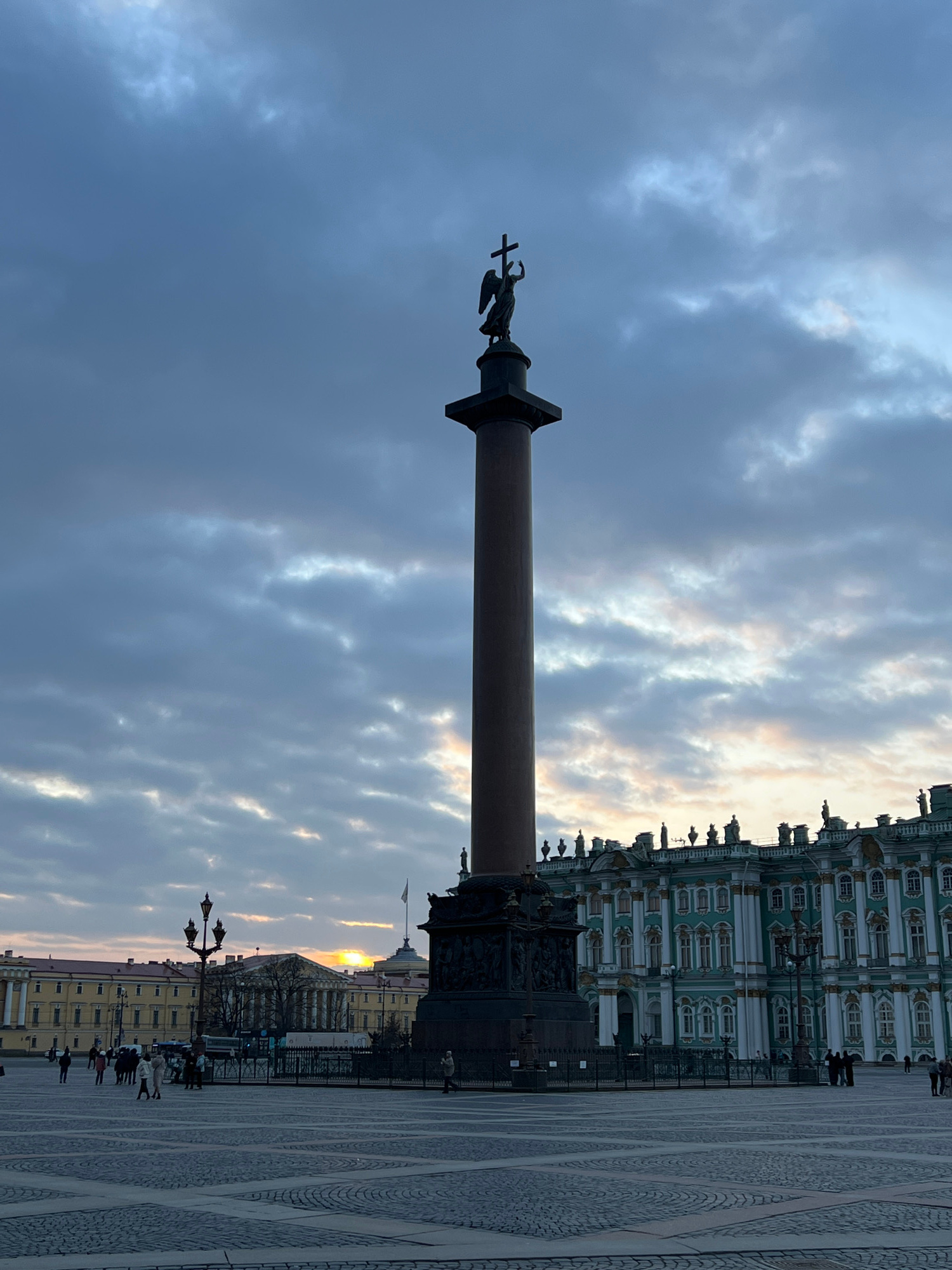 This image captures a view of Palace Square in Saint Petersburg, Russia. Dominating the scene is the Alexander Column, topped with a statue of an angel holding a cross. The Winter Palace is visible on…read more
