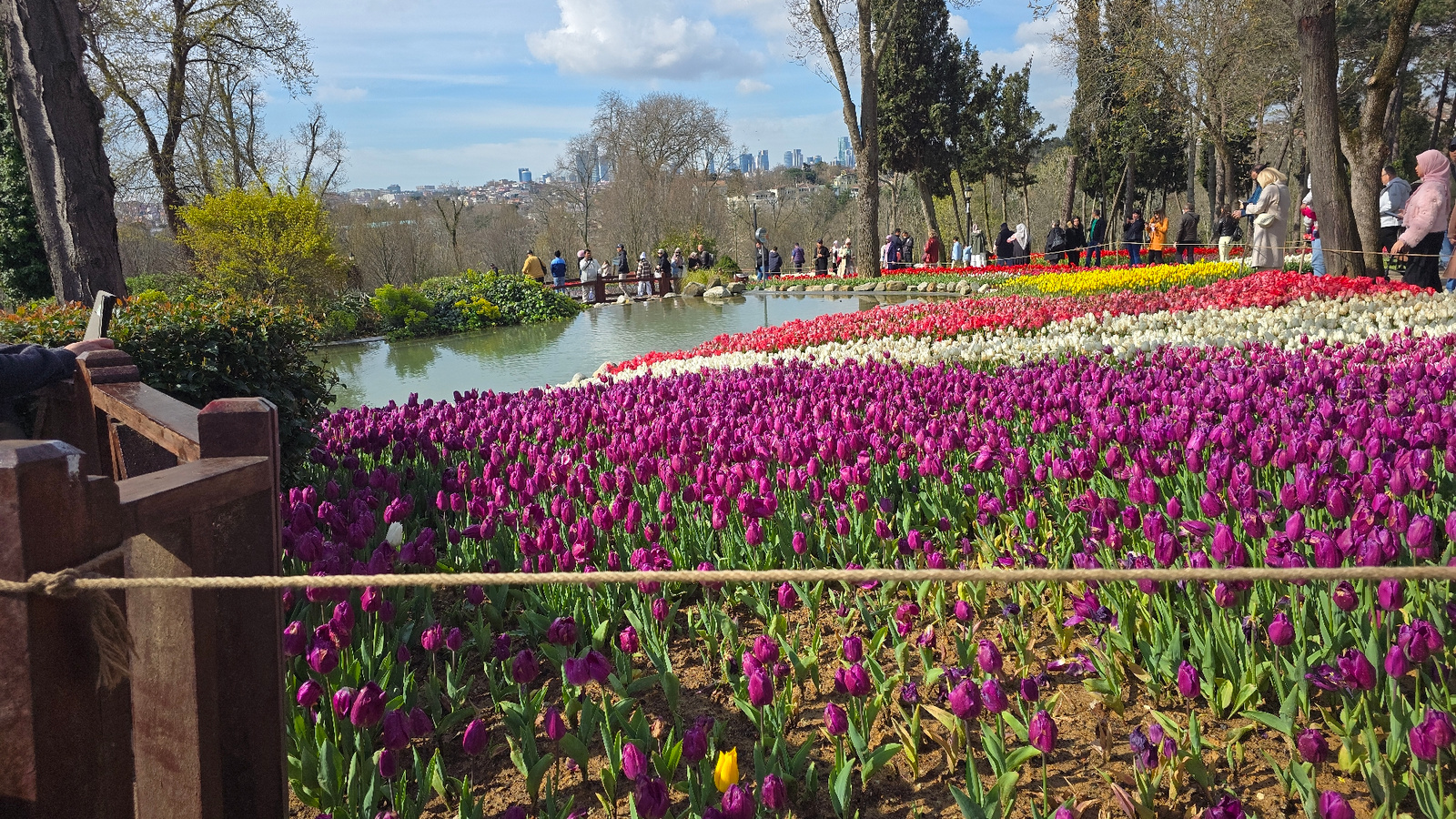 Captured in Sarıyer, Turkey, the image showcases a vibrant tulip garden adjacent to a narrow pond, teeming with a diverse palette of purple, white, yellow, and red tulips. A group of people stand near…read more
