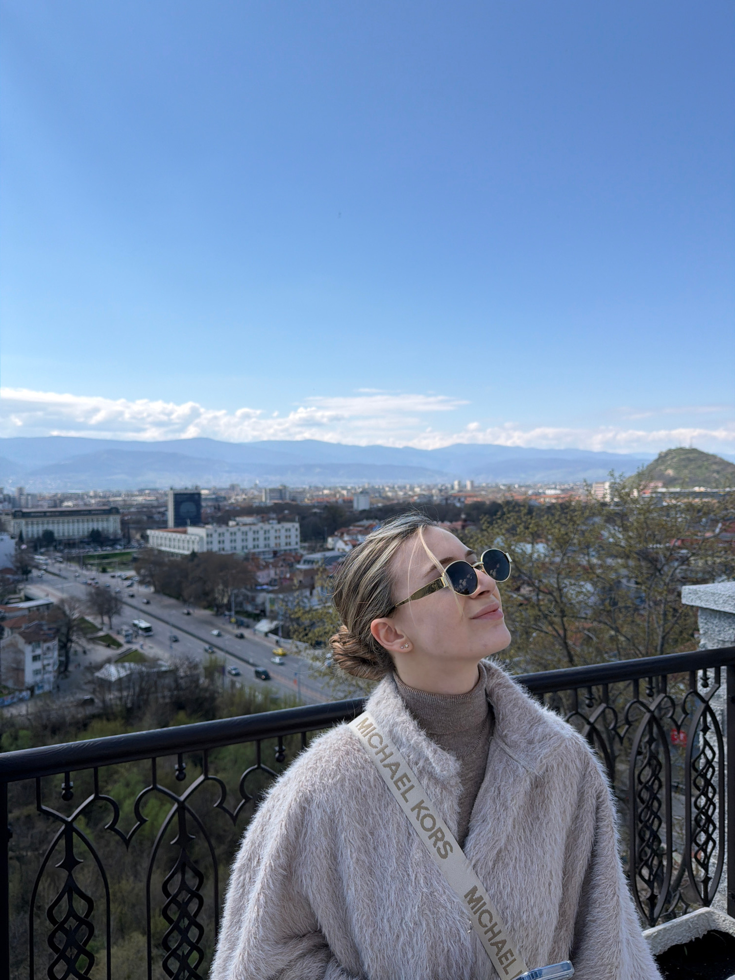 A woman wearing sunglasses and a light-colored, fuzzy coat with a Michael Kors branded strap, is standing on a balcony overlooking a cityscape in Plovdiv, Bulgaria. She is facing towards the left of t…read more
