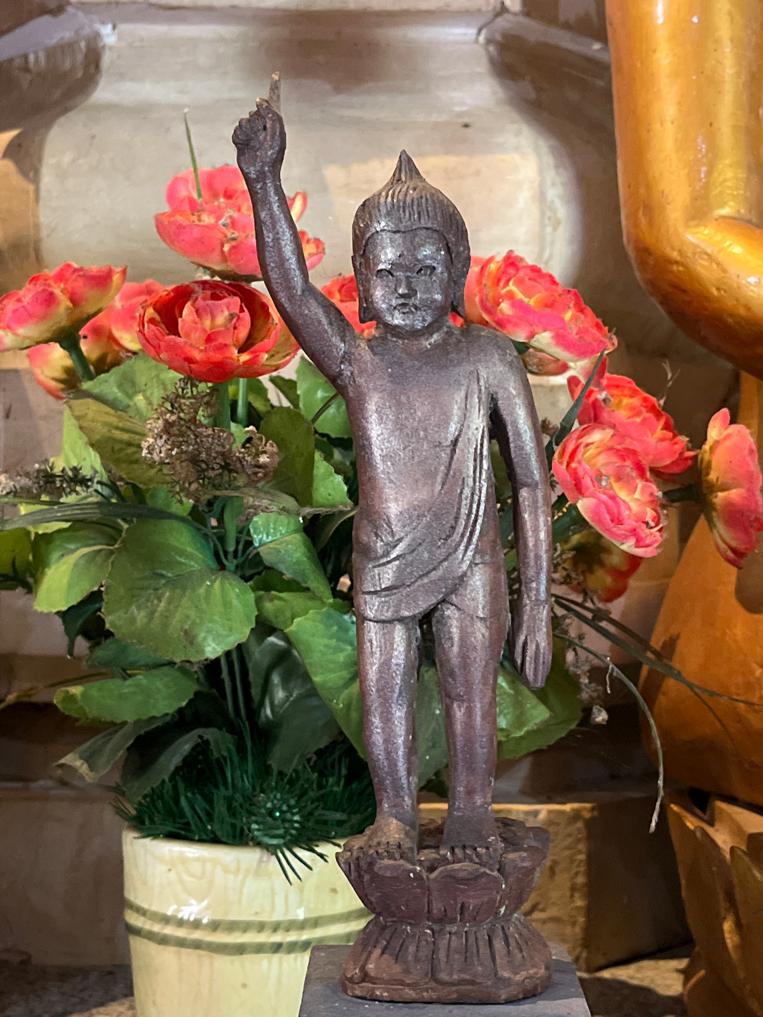 The image depicts a small, dark-colored wooden figurine of a standing child, possibly a deity, set amidst artificial flowers and foliage. The figurine has one arm raised, with the finger pointing upwa…read more