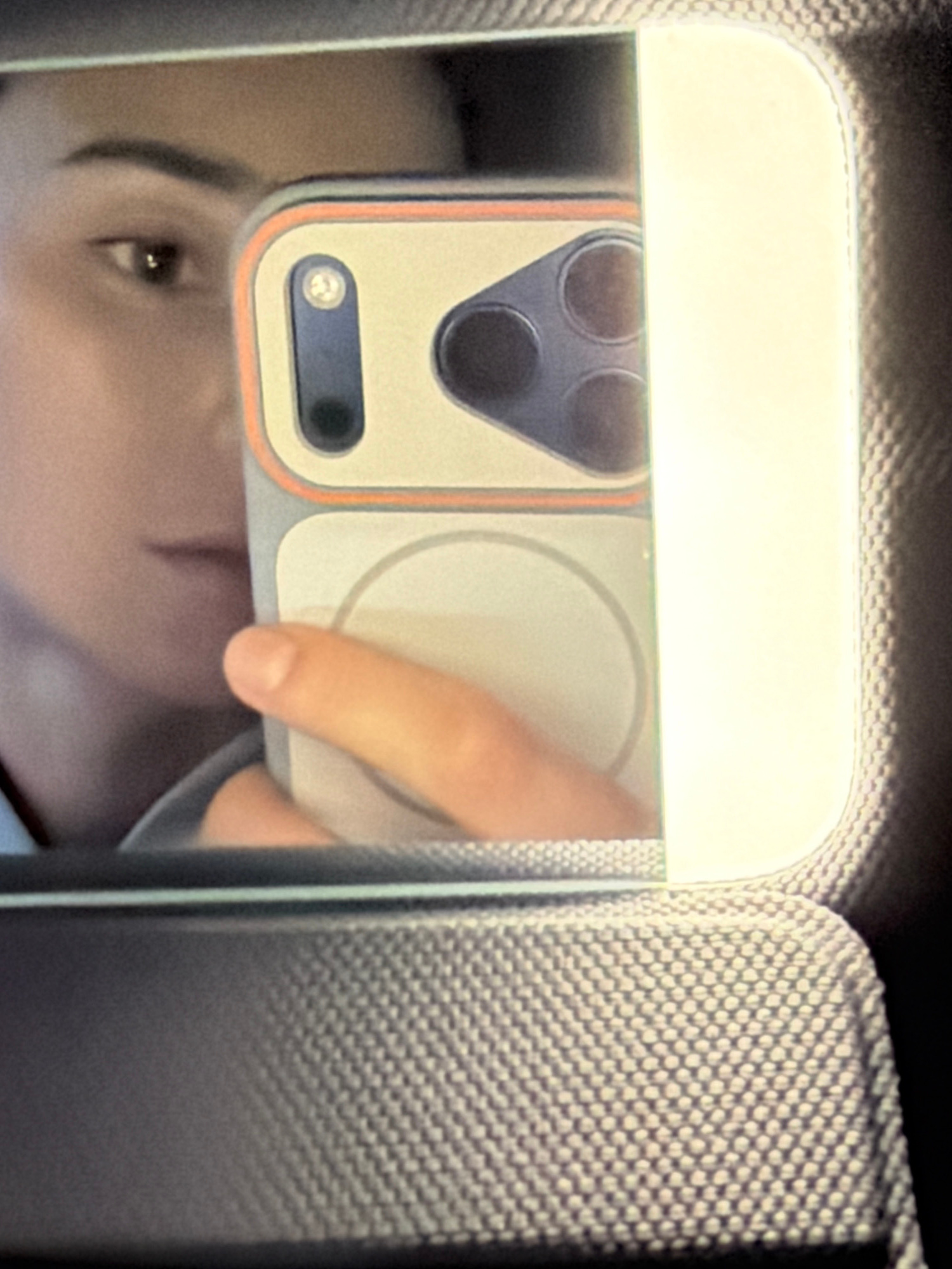 The image shows a person's face reflected in a phone screen. The phone has a light-colored case with a magnetic charging circle on the back. The camera lenses are visible in the top corner of the phon…read more