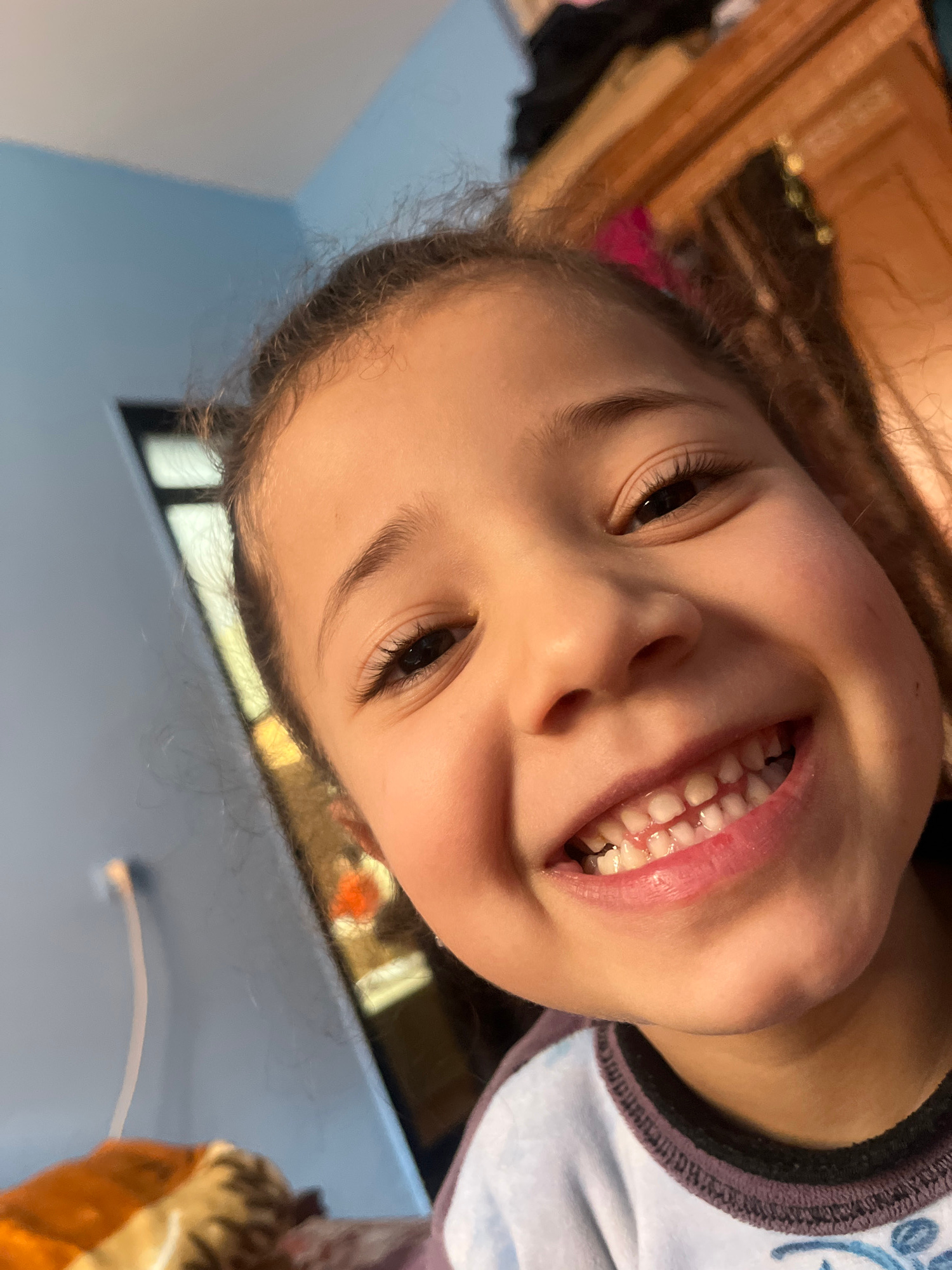 A child with brown hair and eyes is smiling, showing a missing front tooth. The child wears a light blue shirt with a dark collar. The background includes furniture, a wall, and what appears to be a w…read more