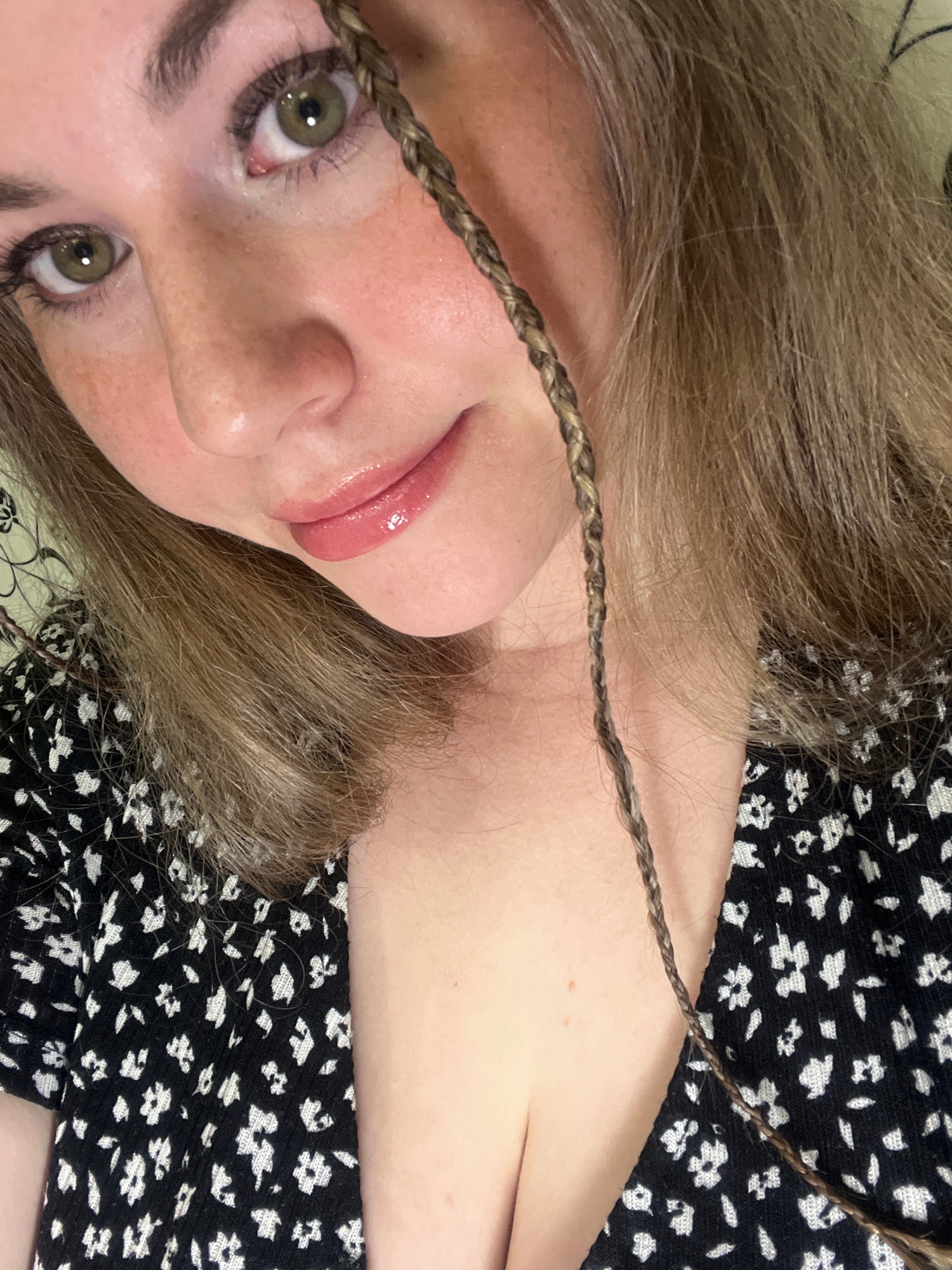 A close-up, slightly angled shot shows a person with fair skin and light brown hair lying down. A thin braid of hair extends across the frame, near the person's face. The person's eyes are green and a…read more