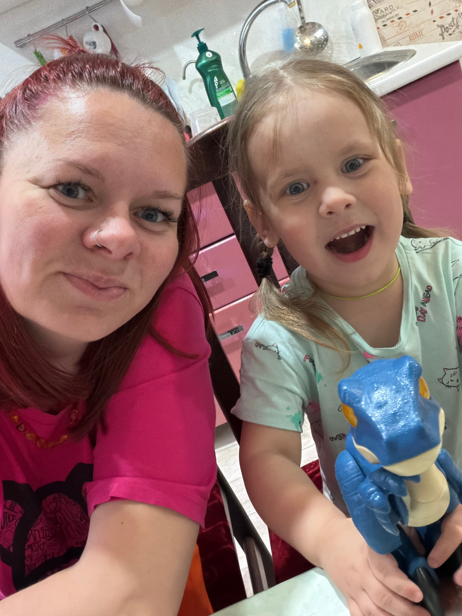 The image is a selfie taken indoors, seemingly in a bathroom or near a wash area, judging by the presence of a sink and toiletries in the background. The foreground is dominated by two individuals: a…read more